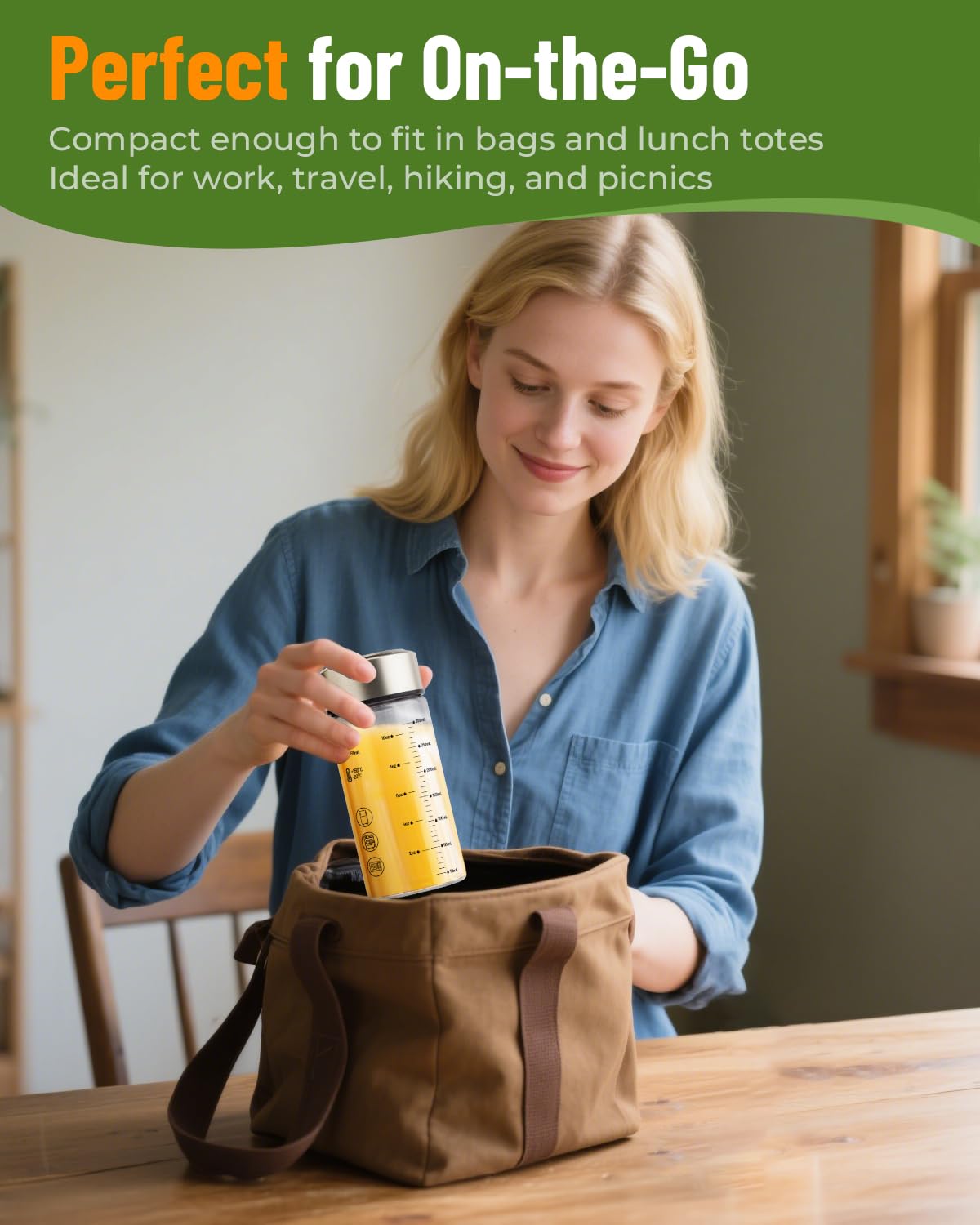 - SLEEK AESTHETIC DESIGN AND DISHWASHER SAFE: The slim, skinny, compact, lightweight and portable design glass bottles fits perfectly in your hand, means you can travel with and take your glass juice jar with cap everywhere, perfectly for garden parties, homemade drinks, picnics, school, work, gym, fitness, yoga. Easily store in the fridge doors, mini fridge, lunch bag, backpack or car cup holder, convenient for using at home, in the office, outdoors and on-the-go