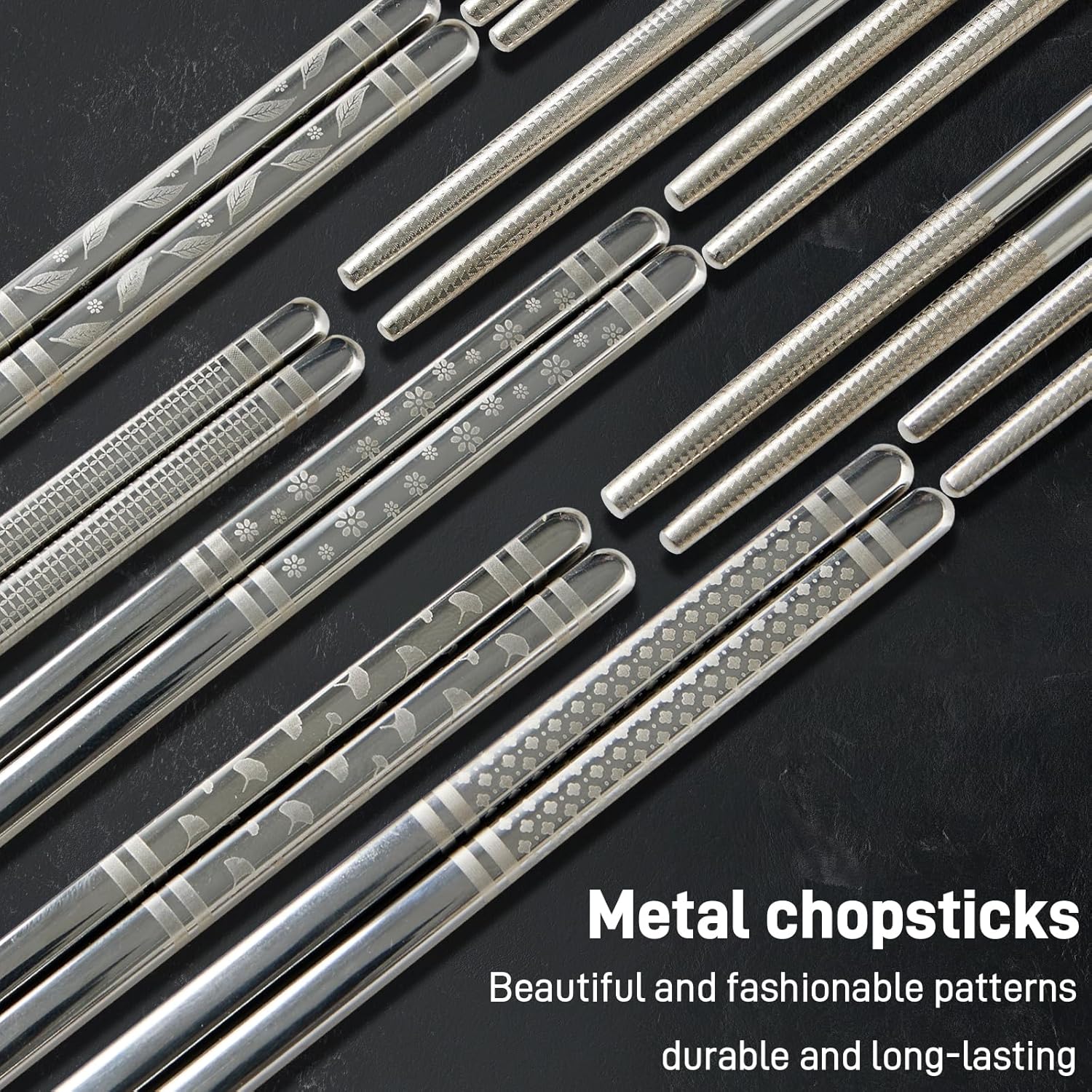 - Unique carved pattern metal chopsticks: Our metal chopsticks feature unique laser engraved patterns and come in 5 different designs, making it easy for every family member or guest to distinguish their chopsticks. These stainless steel chopsticks not only enhance the dining experience, but also add a delicate touch to your tableware