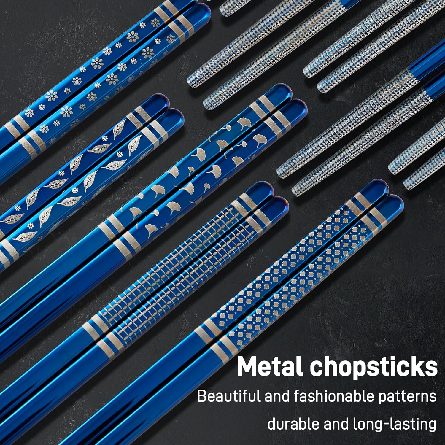 - Unique carved pattern metal chopsticks: Our metal chopsticks feature unique laser engraved patterns and come in 5 different designs, making it easy for every family member or guest to distinguish their chopsticks. These stainless steel chopsticks not only enhance the dining experience, but also add a delicate touch to your tableware