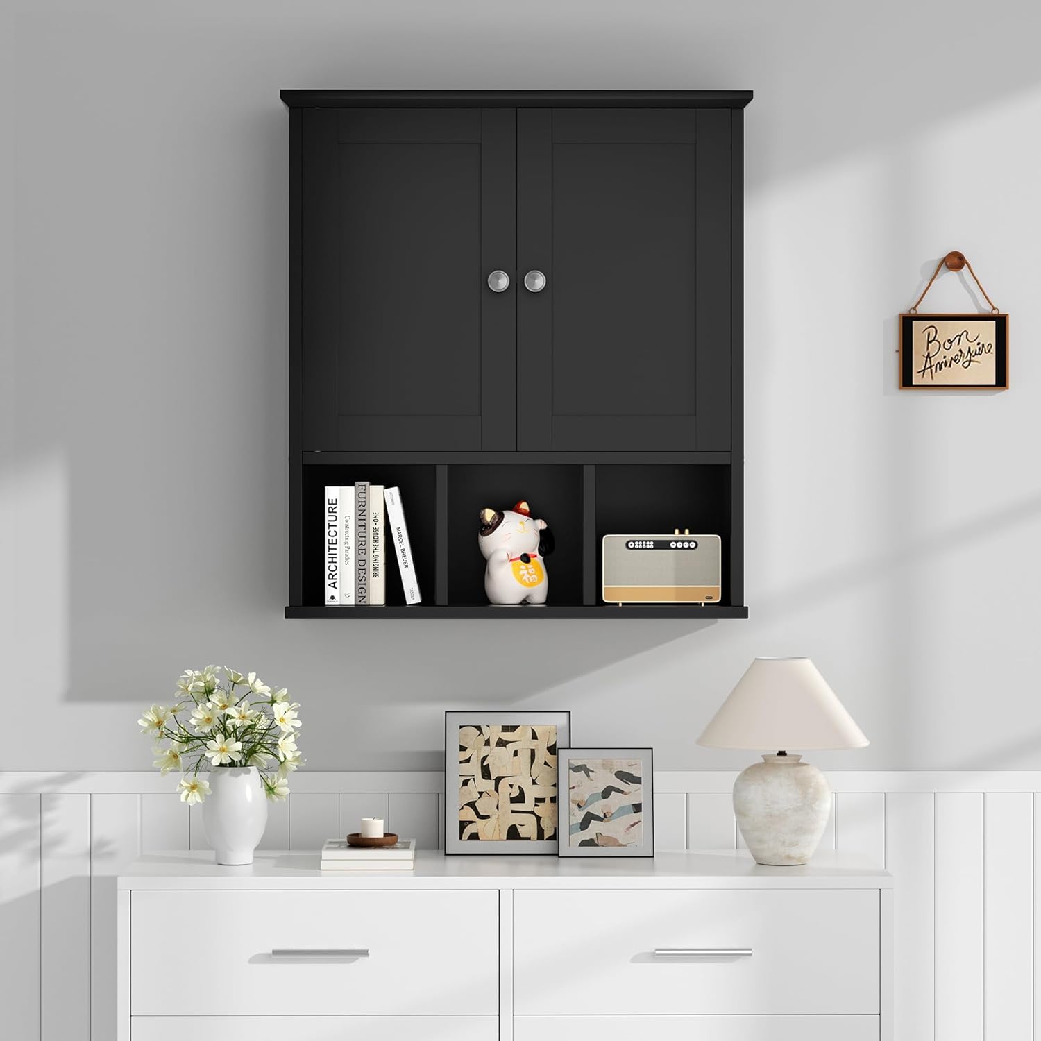 Shintenchi Bathroom Wall Cabinet with Door, Storage Organizer Over The Toilet Medicine, Space Saving with Adjustable & Open Shelf, Black