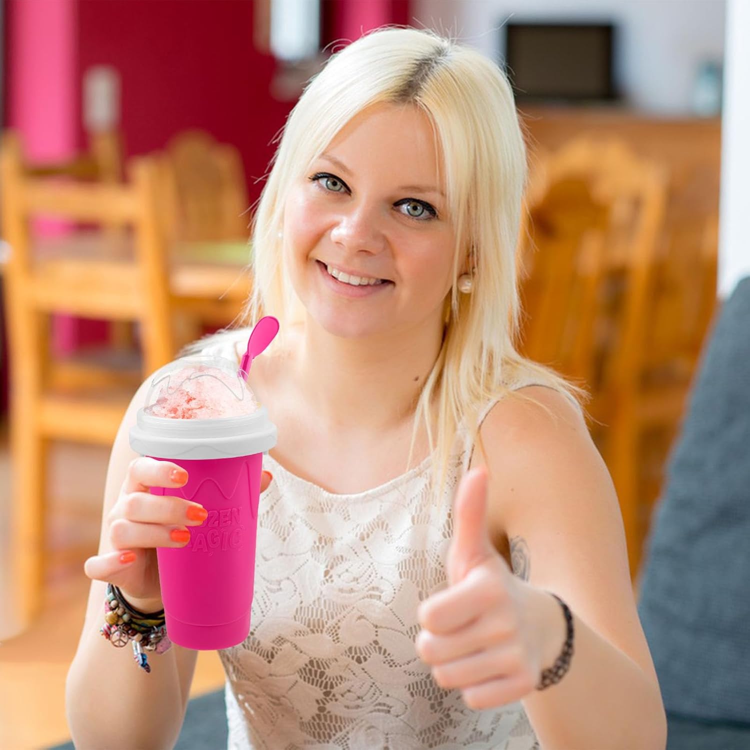 - 【Immersive feel the joy of DIY】The Frozen Magic Cup is very easy to use. First, freeze the smoothie cup 5-6 hours in advance; then pour the prepared milk, juice, soda, beverage, etc. into the smoothie cup and cover it; then just squeeze the cup with your fingers for 1-2 minutes until you see a smoothie shape. Bring you and your family the coolest summer food in the shortest time
