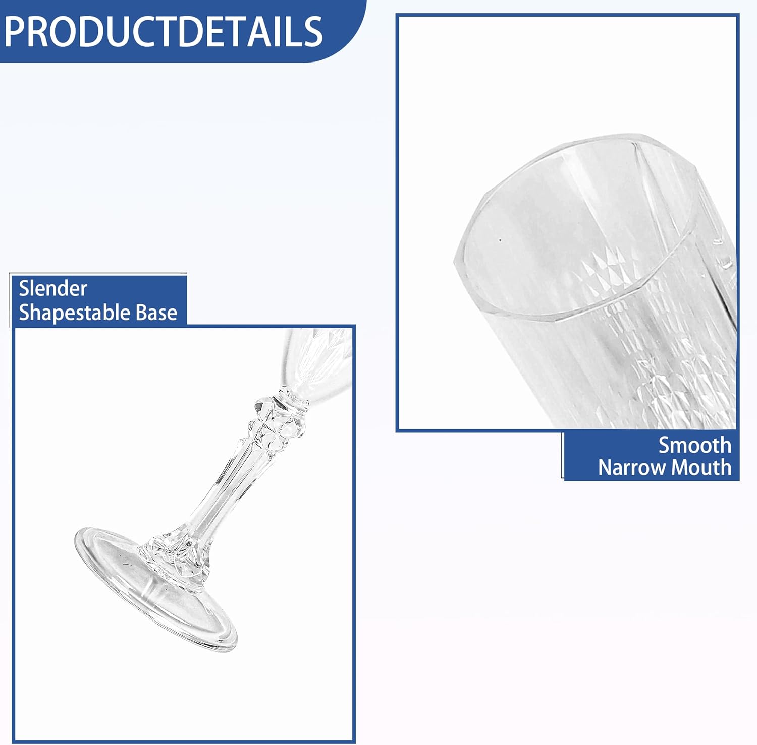 - Charming Set: Champagne flutes set include 48 retro-style transparent champagne plastic wine glasses, providing ample quantity to meet your daily use and replacement needs. A suitable champagne cup is the icing on the cake. Plastic wine glasses not only carry the wine, but also carries the laughter and blessings