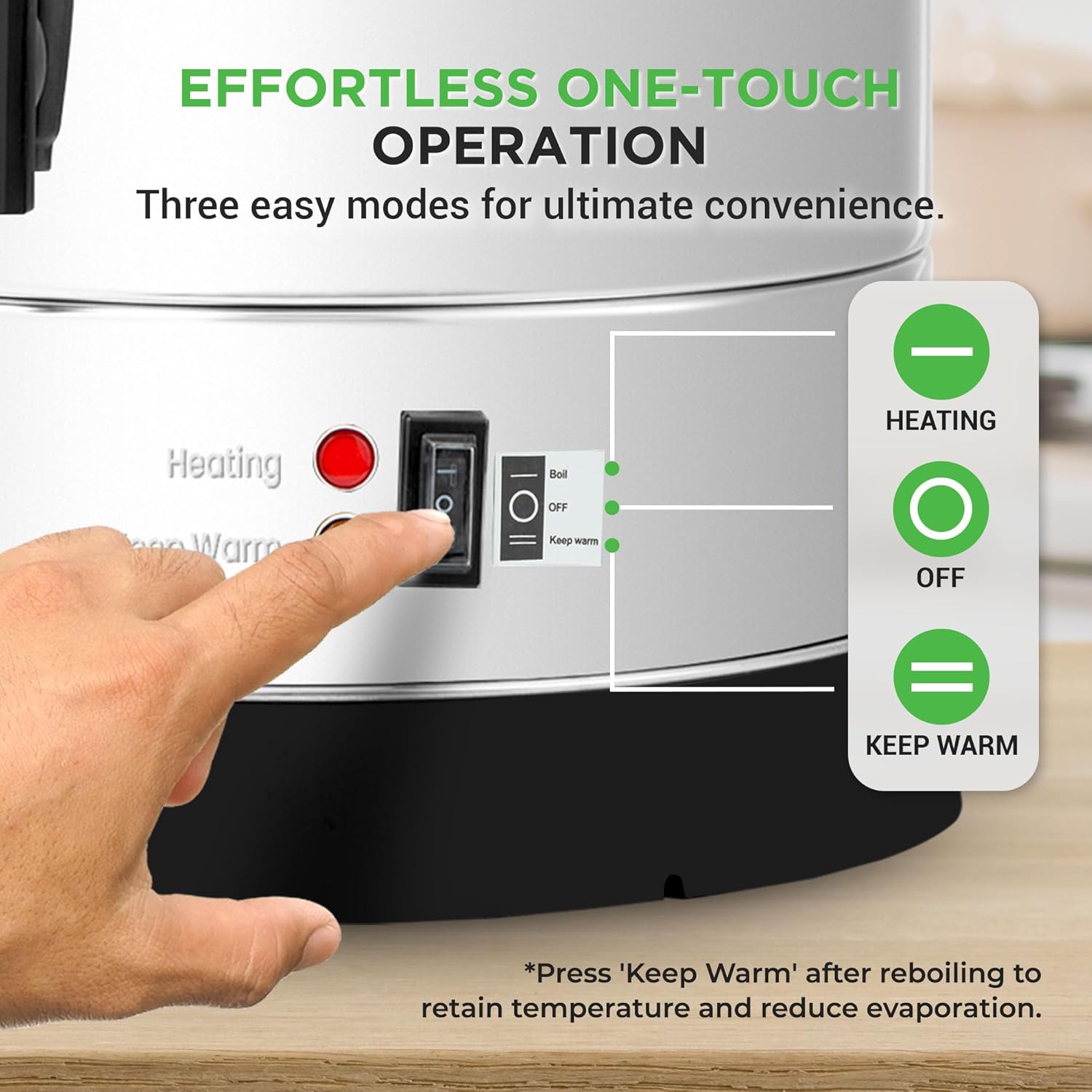 - MULTIFUNCTIONAL ELECTRIC WATER HEATER - With 3 heating modes – Keep Warm, Heating, and Cut Off – this hot water heater electric maintains water temperature between 176°F and 212°F. A water level gauge lets you monitor the water level at a glance.