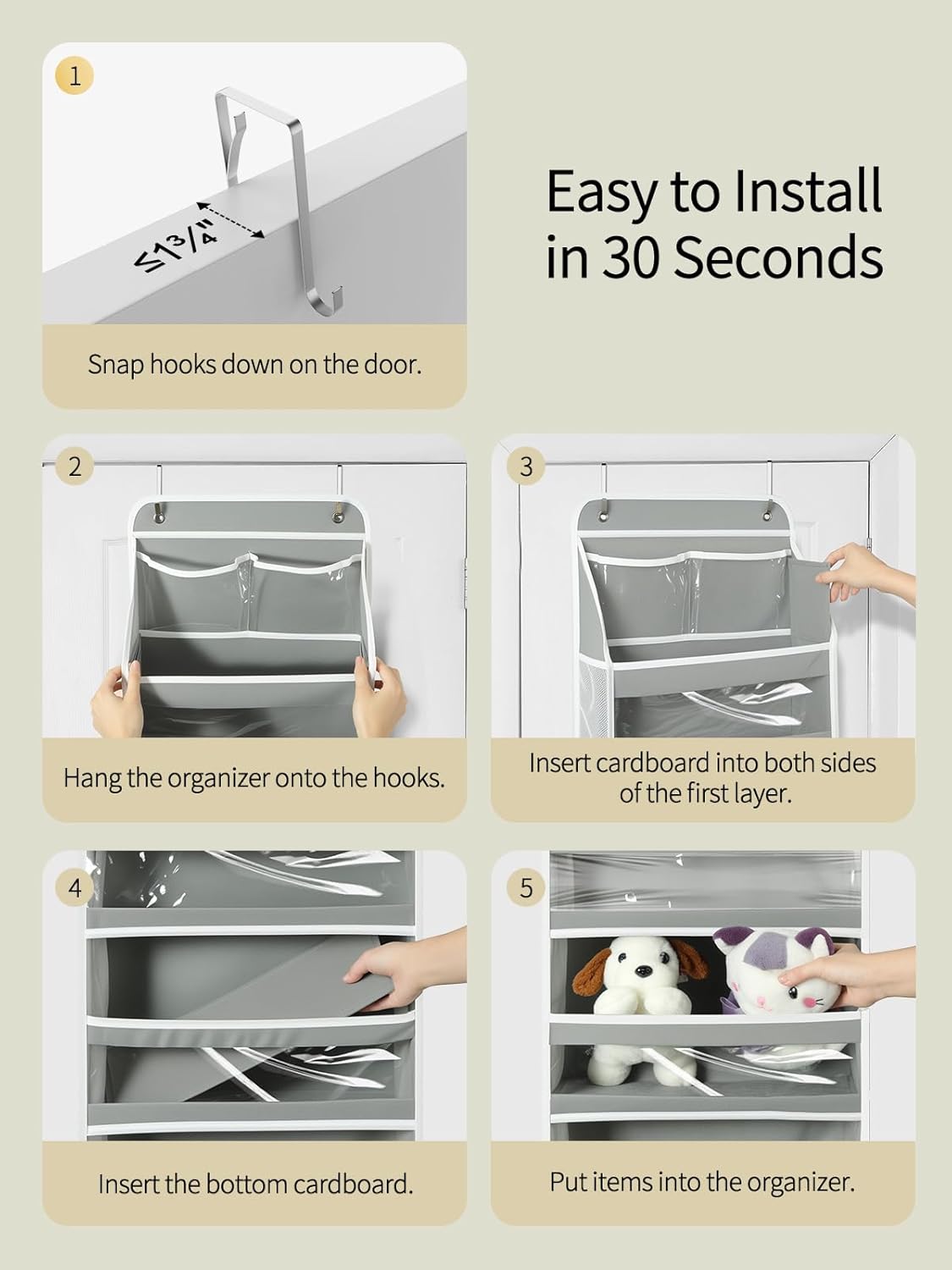- Instant Clutter Fix Hanging Organizer in 30 Secs - No tools or drilling required, just hang it up. Yecaye door hanging organizer makes storage easier than ever! Say goodbye to tedious drilling and wall damage, renters and DIY novices can do it with ease. Whether it's a dorm room, apartment, or a corner of your home, no major renovations are needed—just hang it up and you're good to go. Package includes: 5-tier door organizer * 1, Metal Support Hook * 2, Bottom Support Carboard * 4, Side Support Carboard * 2.