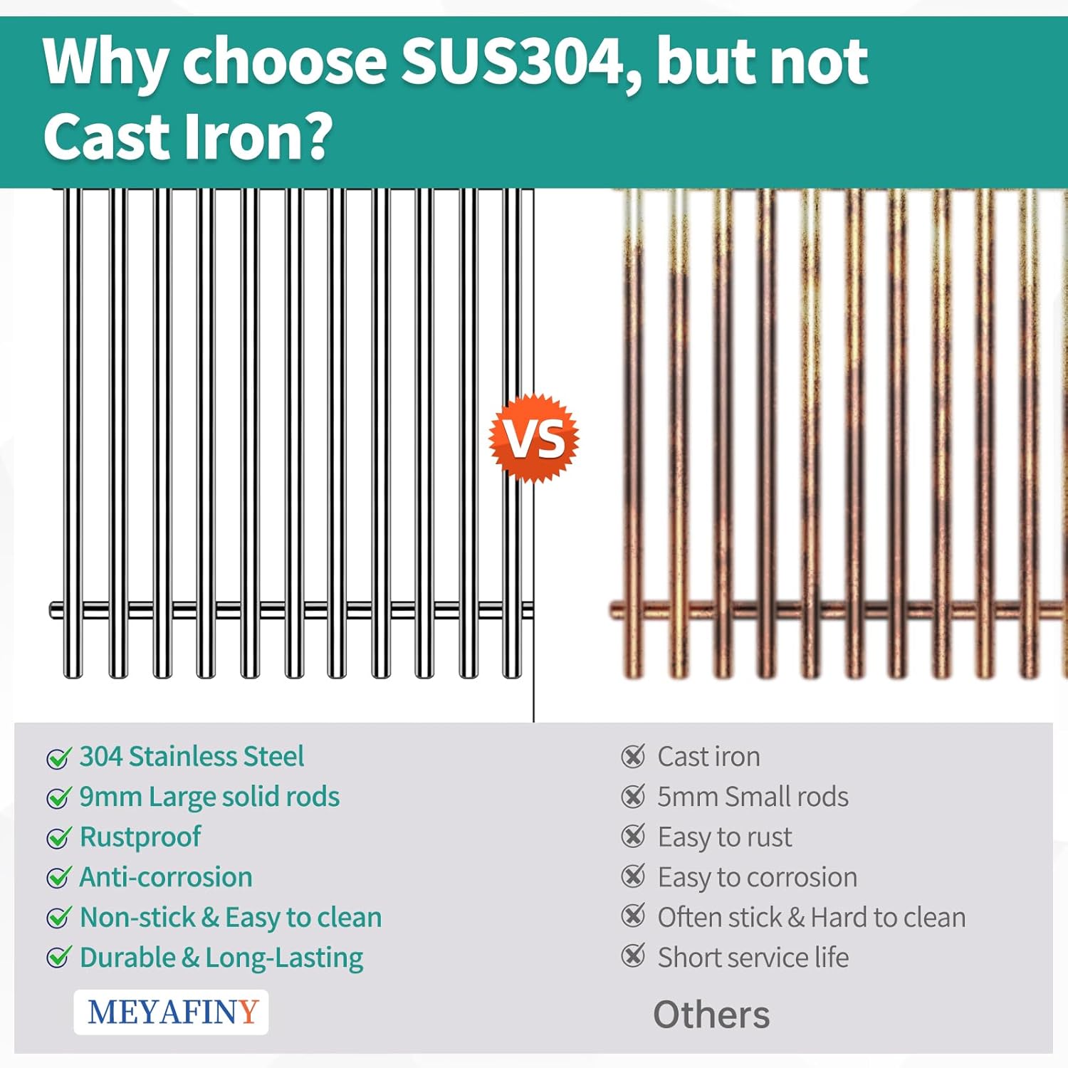 - 【9MM Diameter Solid Rods】Thickness of Meyafiny cooking grate is 9MM, more thicker and stronger than other 5mm/ 7mm grill grates. Our barbecue cooking grids feature SUS304 thicken solid rod bars, which are not easy to deform and more durable for long time using.