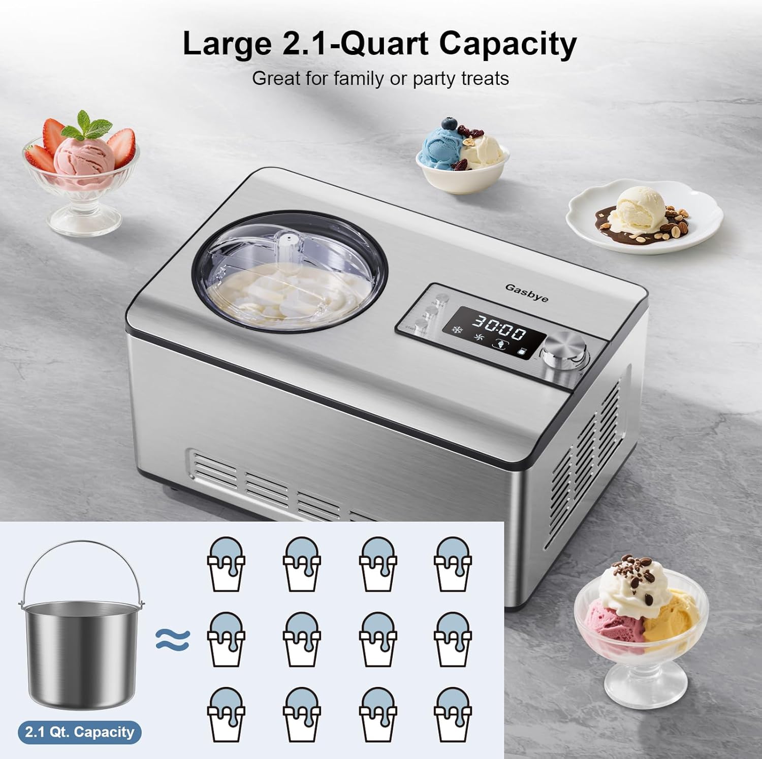 Ice Cream Maker with Upgraded Compressor, [40% Faster Freezing], No Pre-Freezing Needed, LED Display, 2.1 Qt Capacity, Easy Operation for Ice Cream & Yogurt, Stainless Steel