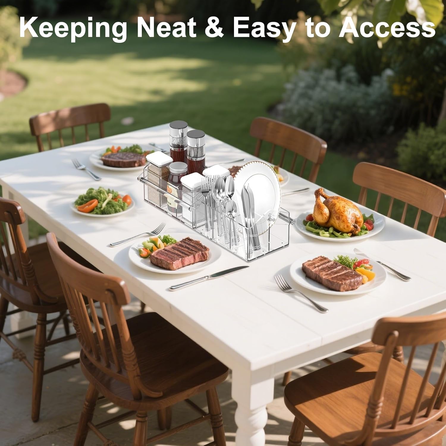 - 【4-Section Tidy Storage for Dining Essentials】 Organize knives, forks, spoons, disposable plates, and napkins effortlessly in four spacious compartments. Perfect as a paper plate organizer for countertops, picnics, or parties, this caddy ensures quick access and clutter-free dining setups.