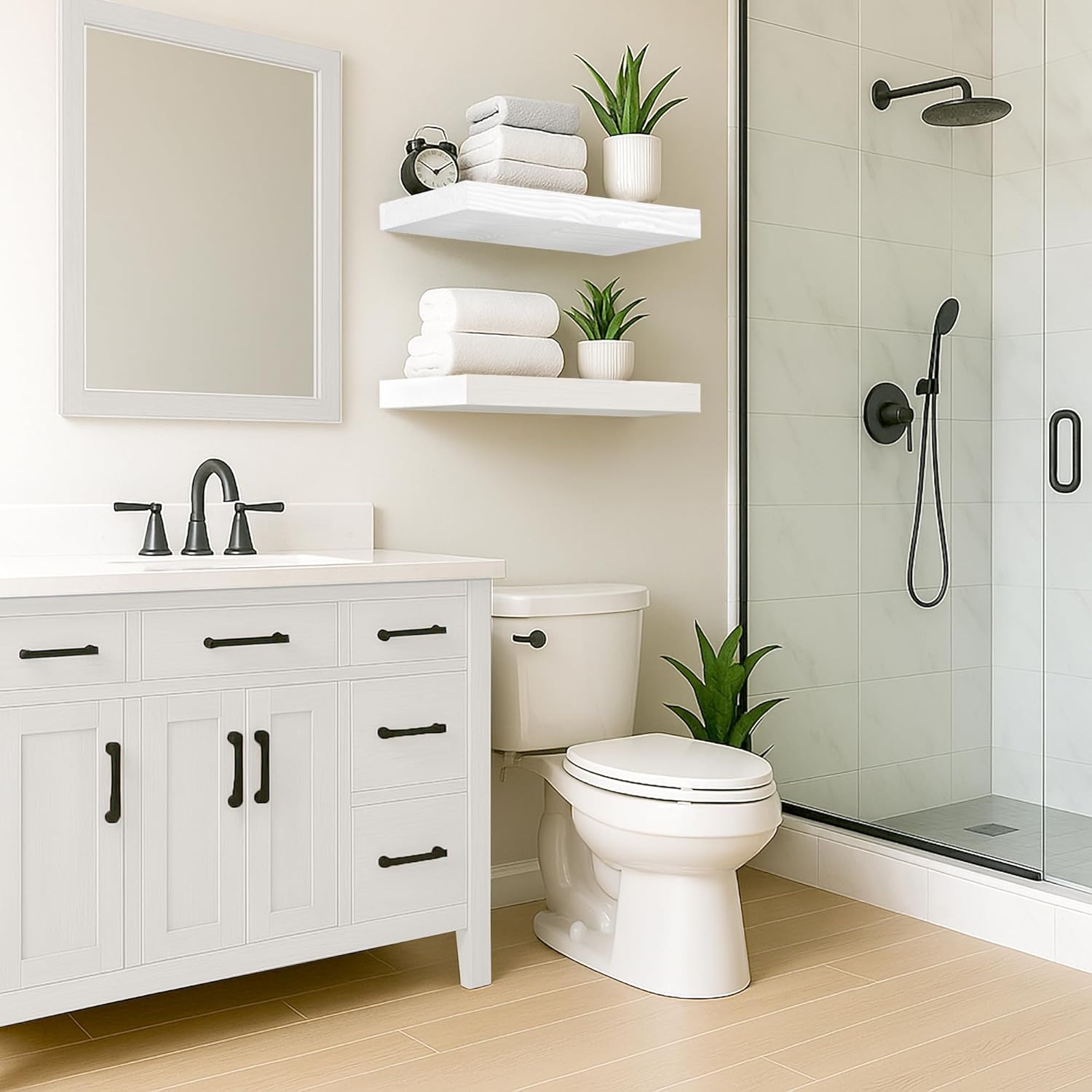 - Seamless Integration: The neutral finish of our floating shelf seamlessly integrates with a wide array of design aesthetics, making it an ideal addition to any home. Enhance your space with this functional piece that combines storage and style effortlessly.
