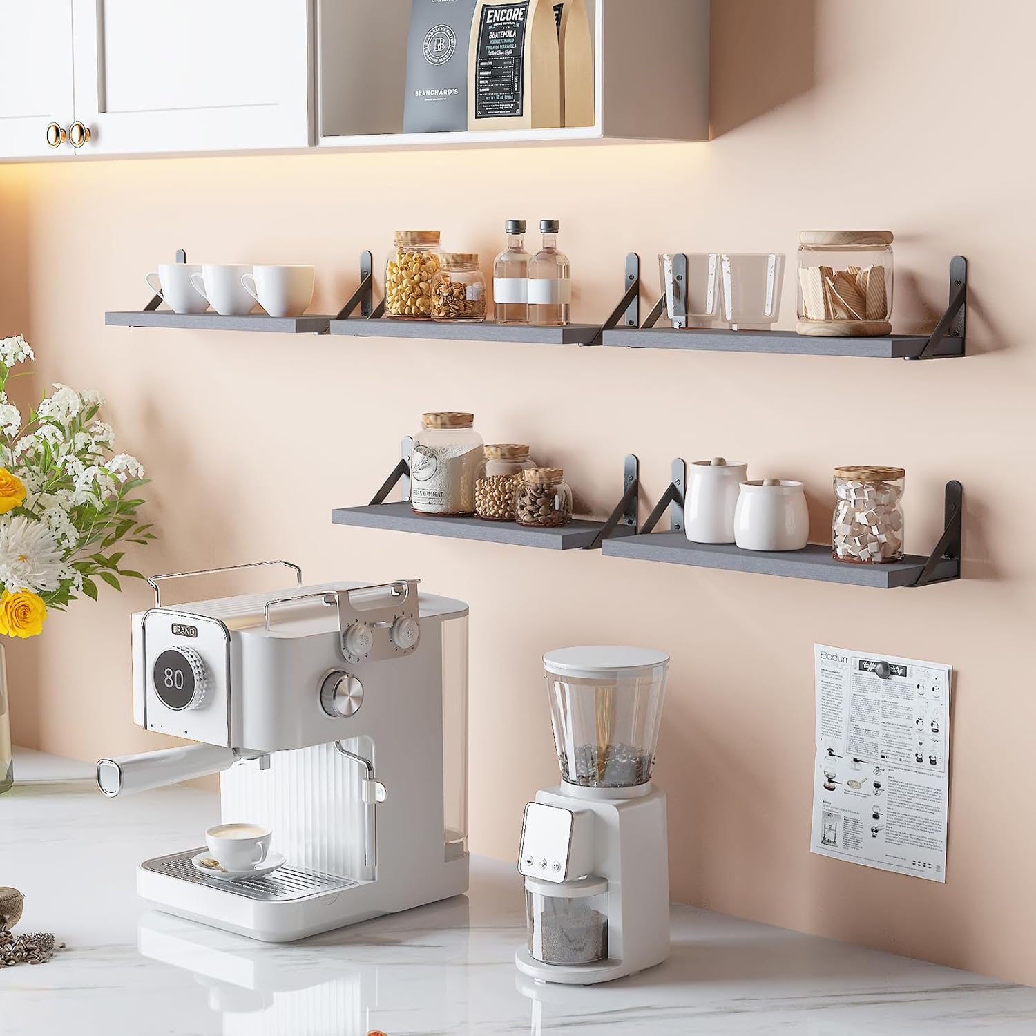 - ăFloating Shelves for WallăThis is a set of Six 16.5 inch long grey wall floating shelves, which is flexible and creative to create your own storage space. Our wall shelves are suit for all-type rooms because they process a simple & simple design.You can combine our floating wall shelves in any way you want.
