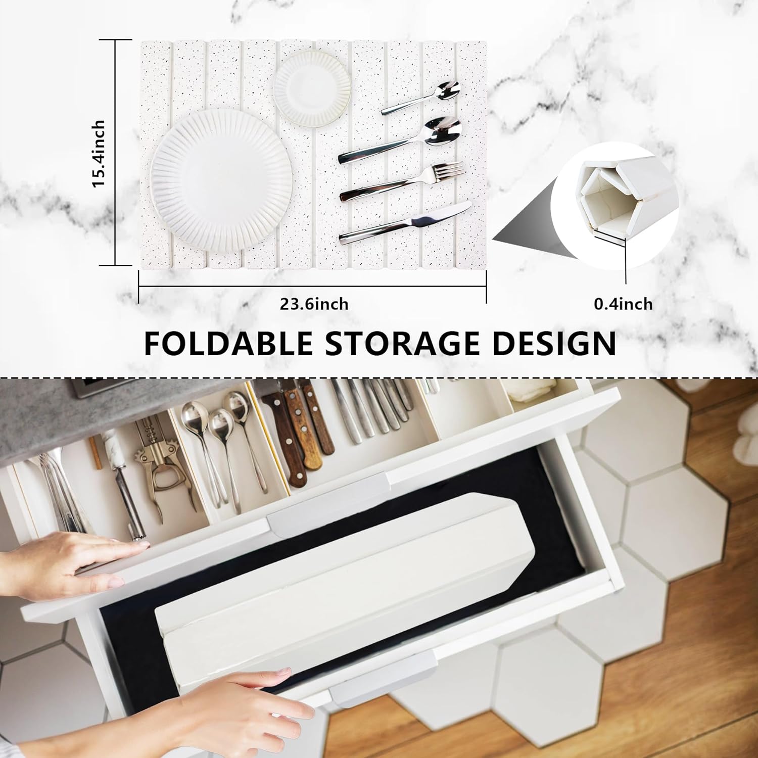 - Related accessory parameters: The unfolded size of our dish drying mats for kitchen counter is 23.6 inches * 15.4 inches, and can be rolled into a roll of 15.4 inches * 4.7 inches * 4.7 inches after folding, which is convenient for storage. We also considerately equip you with a 17.7 inches * 13.7 inches anti-slip mat and sandpaper with a diameter of 2.95 inches for dealing with stains, as well as an instruction manual.