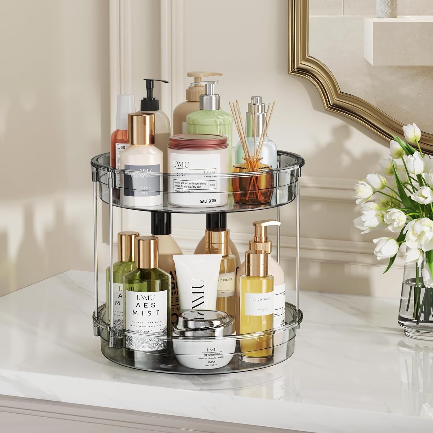 LAMU 2 Pack 2 Tier Lazy Susan Turntable Organizer 12'' Rotating Spice Rack Organization for Cabinet, Kitchen, Pantry, Countertop, Bathroom, Vanity, Medicine Cabinet Organizer, Grey