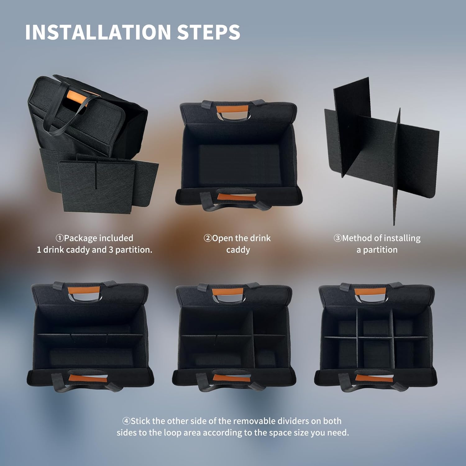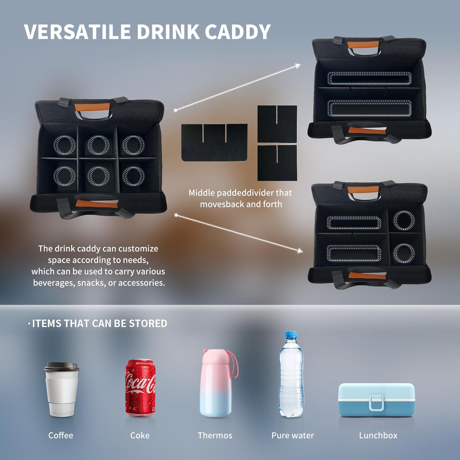 - 【ADJUSTABLE DIVIDERS】This drink carrier bag is designed with a built-in divider, making it extremely convenient for users. The built-in divider allows for easy organization and separation of different items. Whether you are carrying drinks, snacks, or other essentials, our Drink Caddy can be easily adjusted to accommodate your needs. It can be folded to create extra space when necessary, making it versatile for various settings.