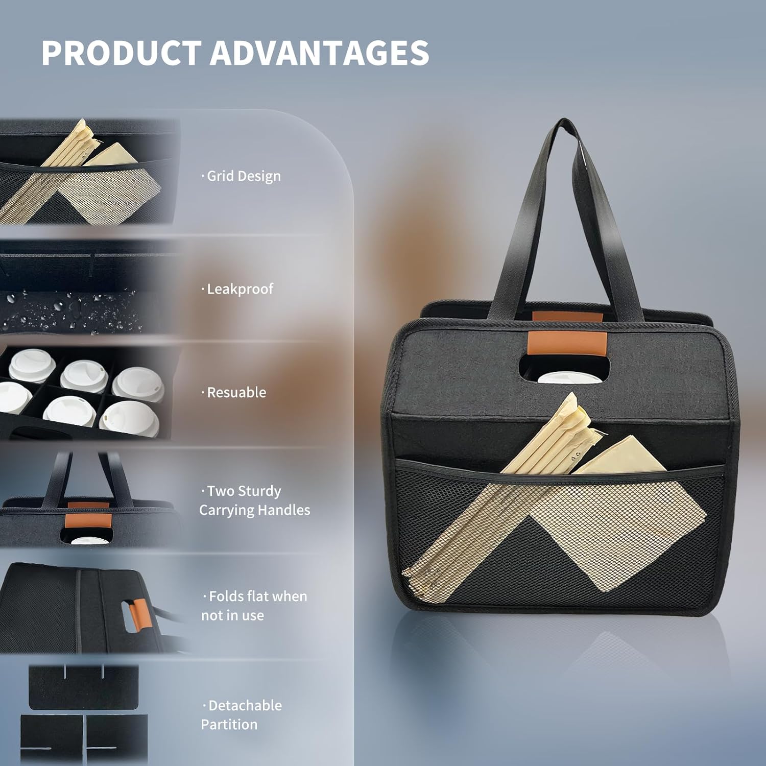 - 【VERSATILITY DESIGN】Our reusable and portable drink cup carriers are a great alternative to disposable cardboard or plastic drink trays. They are designed to help you easily carry beverages of various sizes to any location. Additionally, we offer two different options for picking up the drink cup bag, catering to your specific requirements. The clamshell design enables quick and convenient pickup, making it ideal for food delivery and takeout purposes.