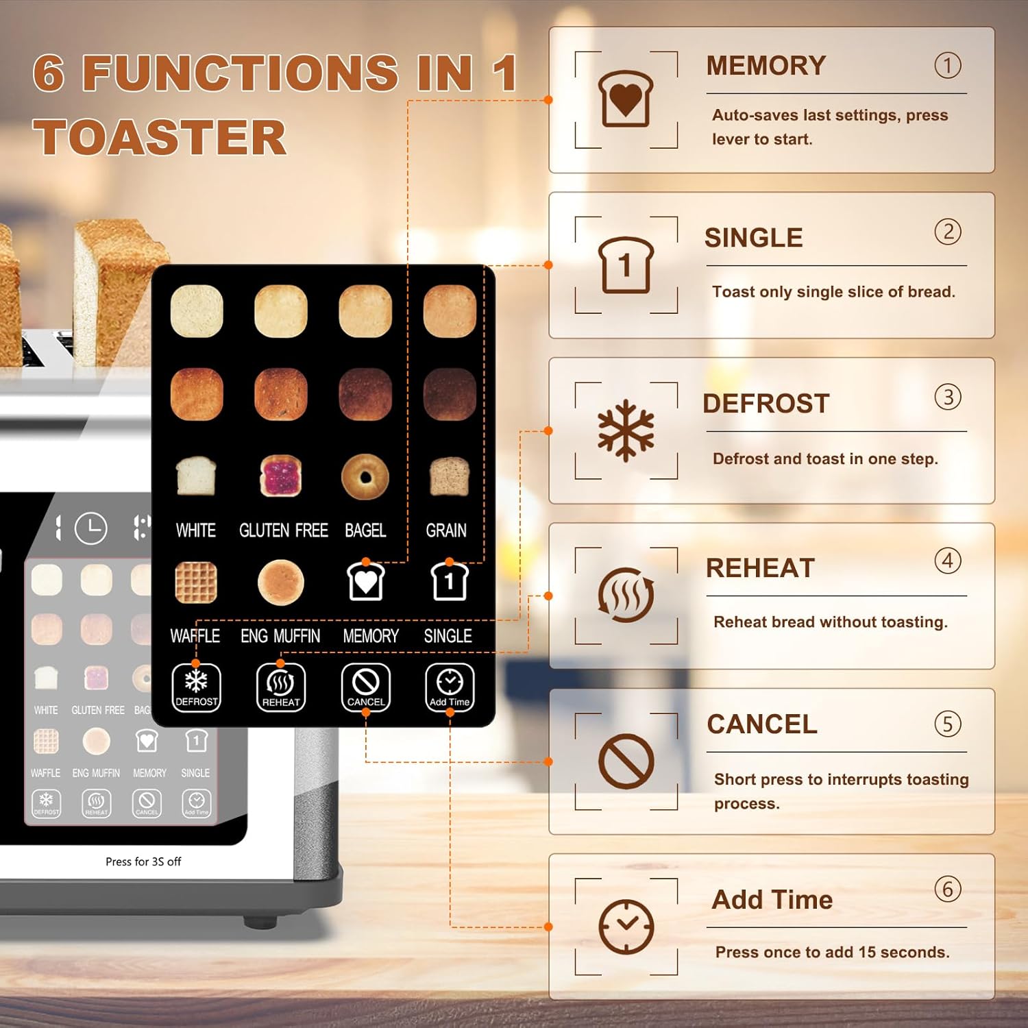 - Peculiar Functions: Except Cancel, Defrost, Reheat functions, we specially added Bread Type, Memory, Sigle slot to toast, Add Time functions. 6 bread type including bagel, white, waffle, eng.muffin, gluten free, grain.