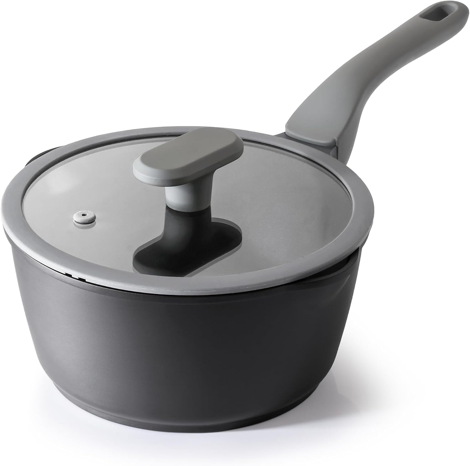 PRICUSIS Nonstick Saucepan with Lid, 2.7 Quart Non Toxic Pot with Pour Spouts, Full Coated, 100% Dishwasher Safe, Induction Compatible & Oven Safe, PTFE & PFOA Free, Black Sesame
