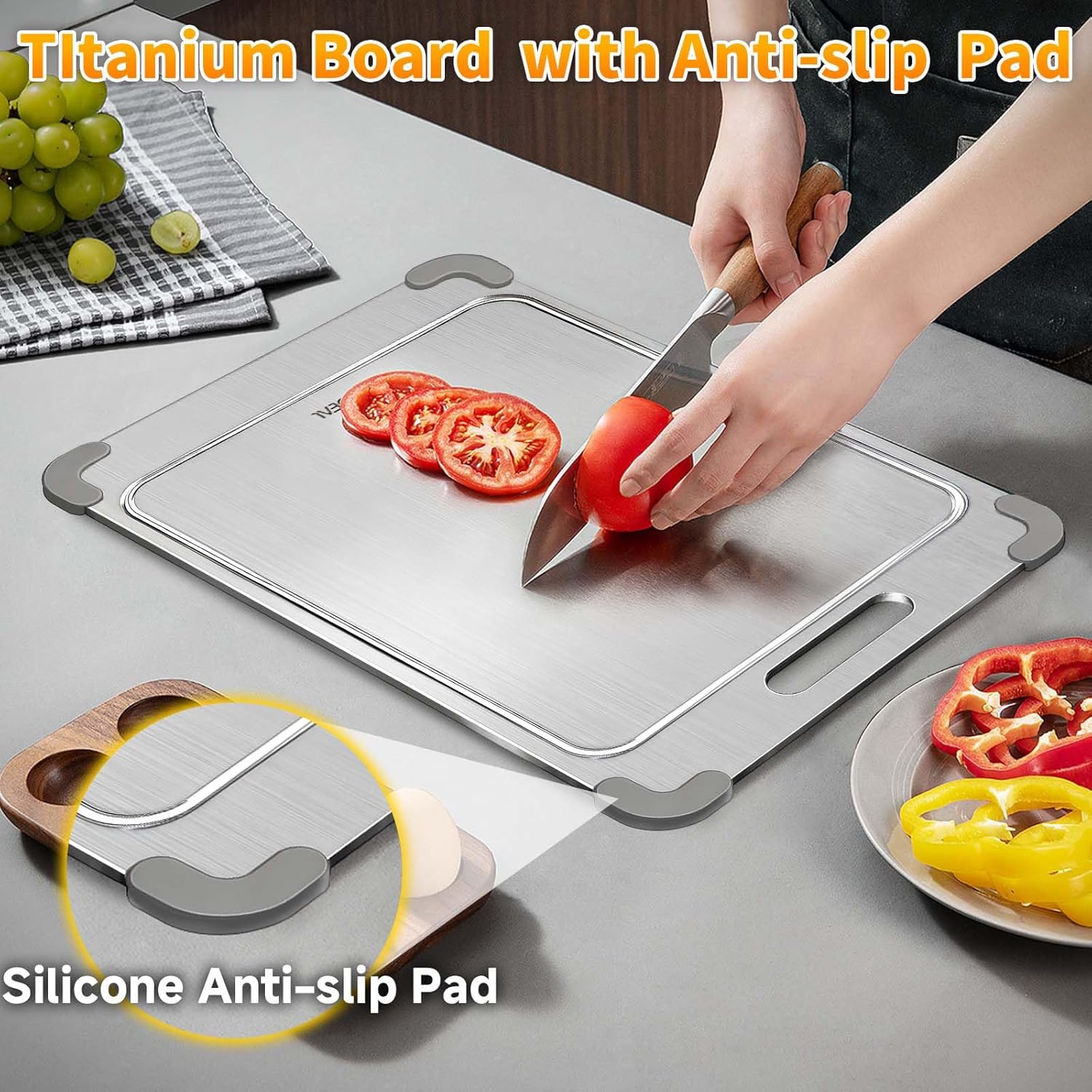 - Upgraded Removable Silicone Non-slip Corner Pad- solves the disadvantage of ordinary titanium chopping boards that are easy to slip with the countertop and not easy to pick up when in use.