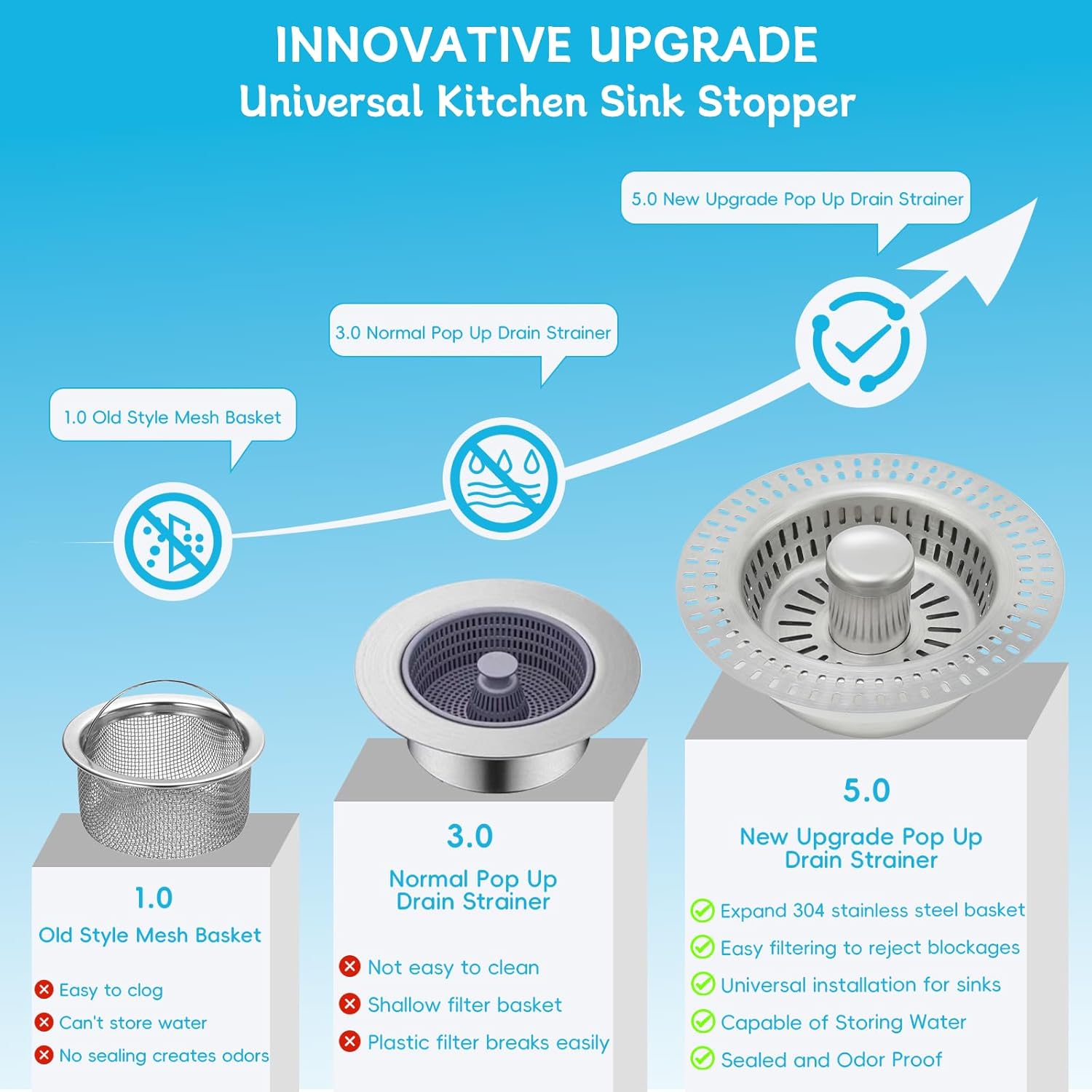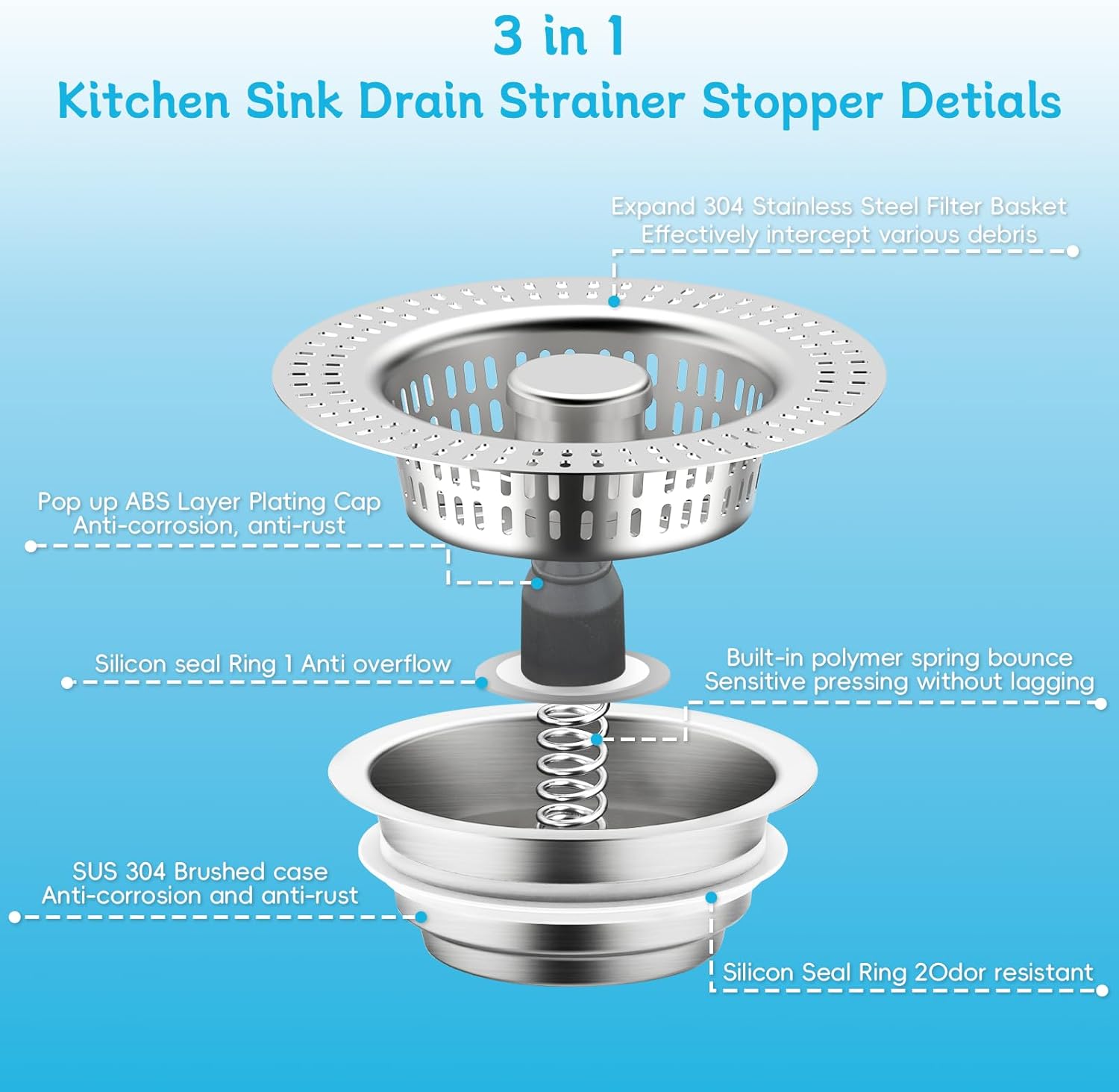 3 in 1 Kitchen Sink Drain Strainer, Upgraded Pop Up Kitchen Sink Stopper with Enlarged 304 Stainless Steel Anti-Clogging Food Catcher Basket Strainer, Fit US Standard 3-1/2'' Kitchen Sink Drain Hole