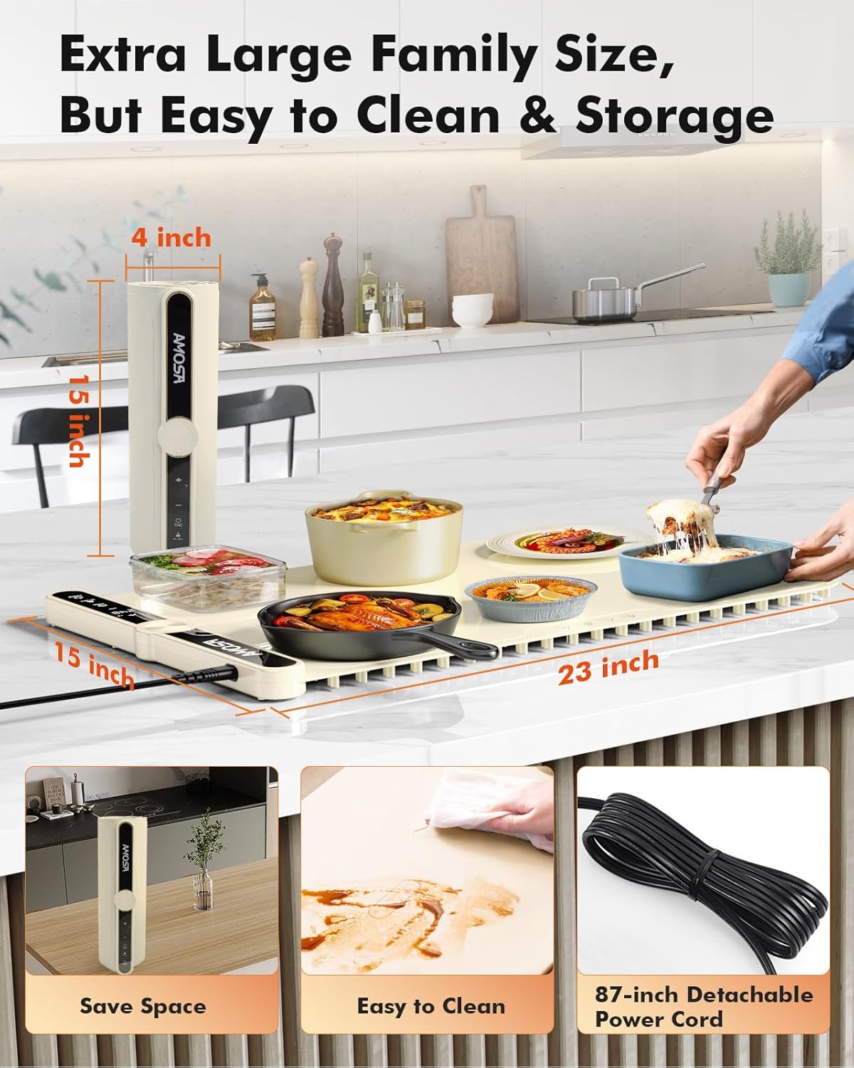 - 【Large Size & Easy Store and Clean】Made of high-quality food-grade silicone material, no odor, comfortable touch and durable. Its surface is splash-proof, oil-proof, and stain-proof, and can be cleaned with a light wipe. The silicone used in the warming mat has excellent flexibility, is easy to roll up for storage, saves space and portable. The electric warming tray can be unfolded to 23 inches * 15 inches when in use, and is also equipped with a detachable power cord extended to 87 inches to meet your daily use needs.