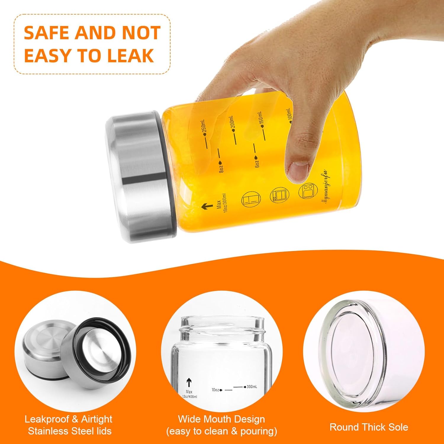Glass Juice Bottles 4 Pack 10 oz - Wide Mouth Glass Water Bottles with Lids - for Juicing, Smoothies, Milk, Protein, BPA Free, Reusable, Stainless Steel Lids, Leak Proof, Shaker bottle [10oz/300ml]