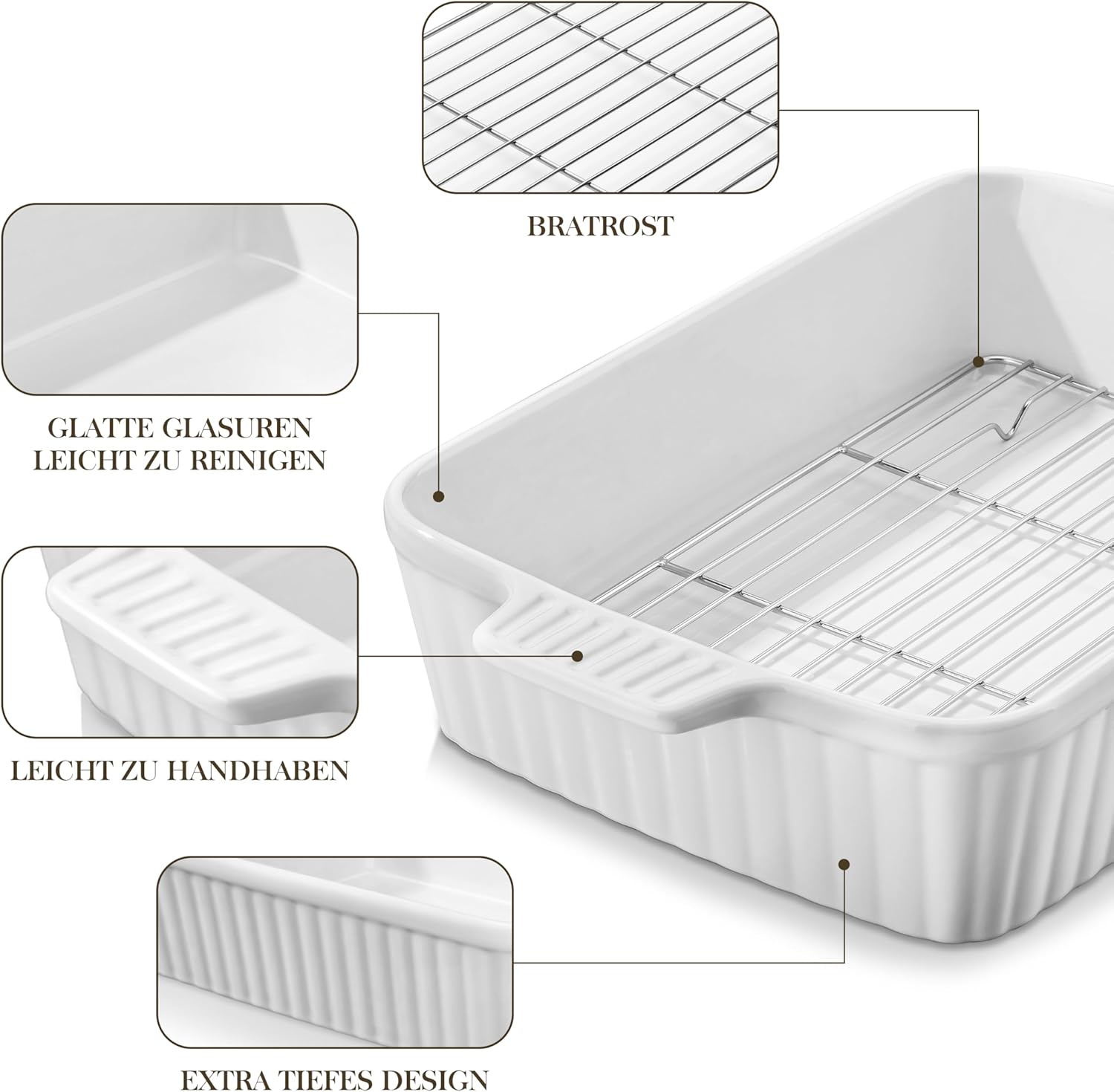 MALACASA 4.4 QT Baking Dish with Rack, 9x13 Large Casserole Dish for Oven, Ceramic Baking Pan with Rack, Rectangular Lasagna Pan Deep with Handles for Baking, Durable Microwave Oven Safe, White