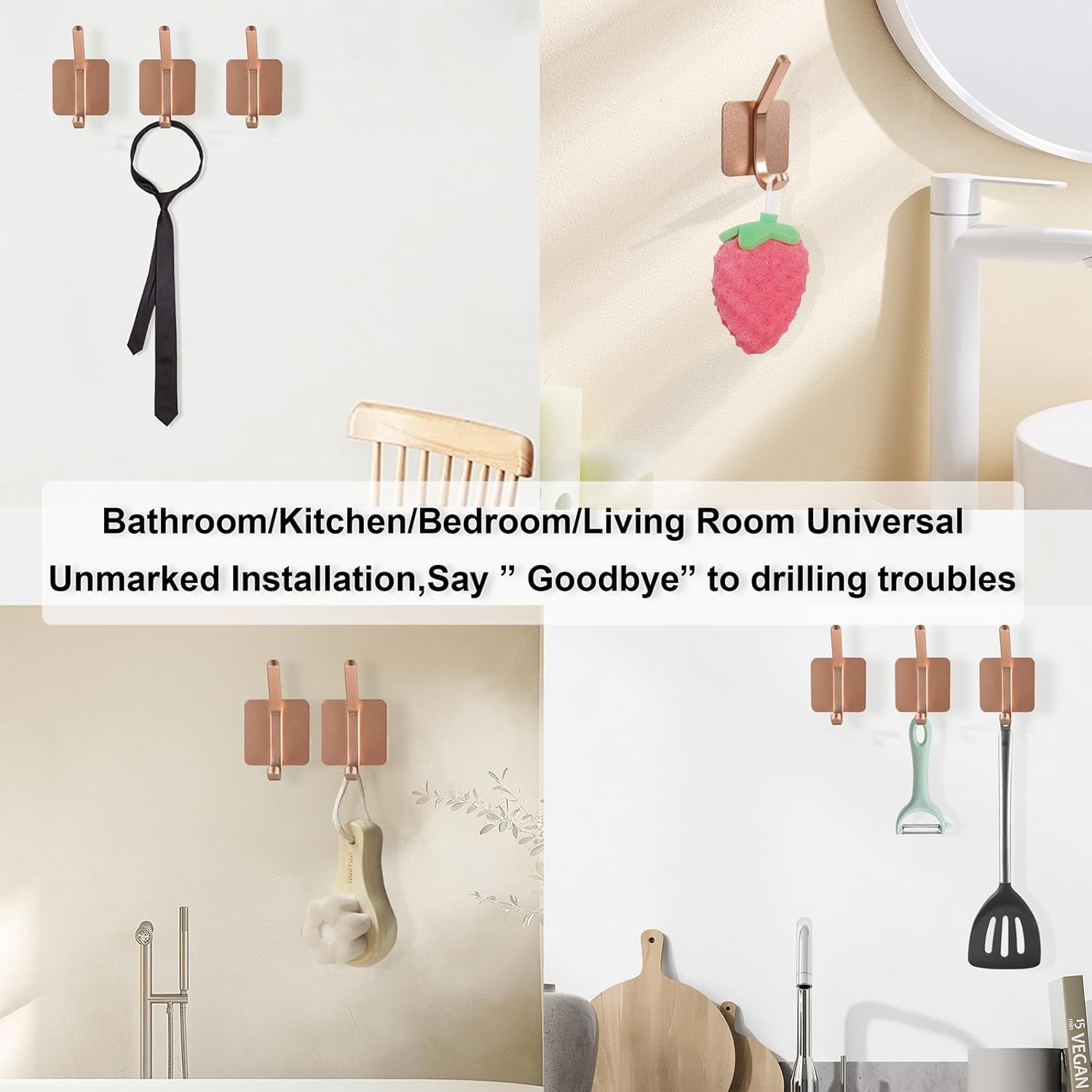 Aluminum Wall Hooks, No Drill Damage-Free Adhesive Hook, Product for Hanging Heavy Duty for Bathroom Kitchen Home (Double Square Rose Gold Hook, 4)