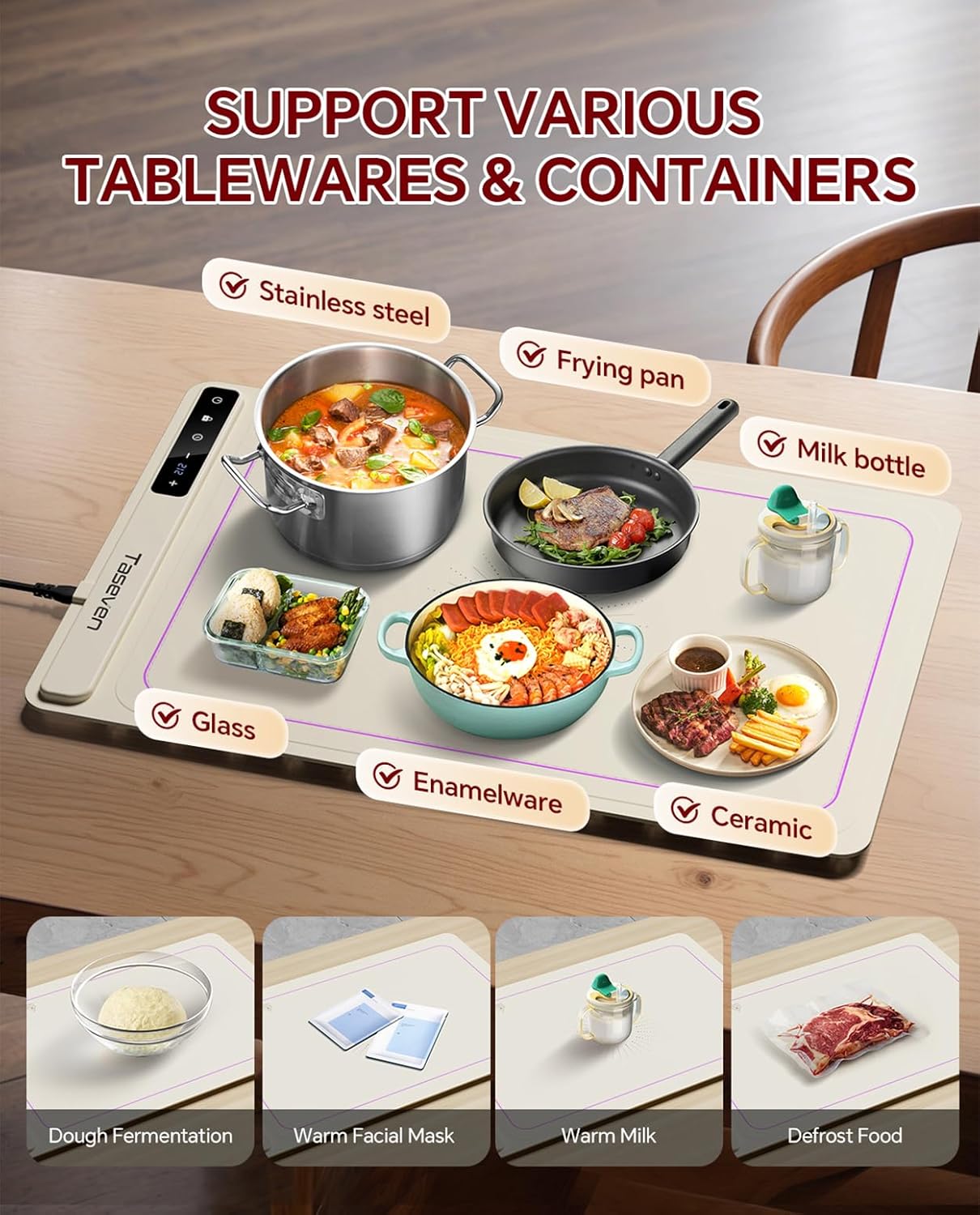 - Widely Compatible and Various Occasion: Our food warming mat is suitable for all types of dinnerware, including metal, ceramic, glass and enamel,to meet your daily needs. Our food heater is also a useful tool, with mask heating, dough fermentation and defrosting all easy to operate. Suitable for home use in all seasons!