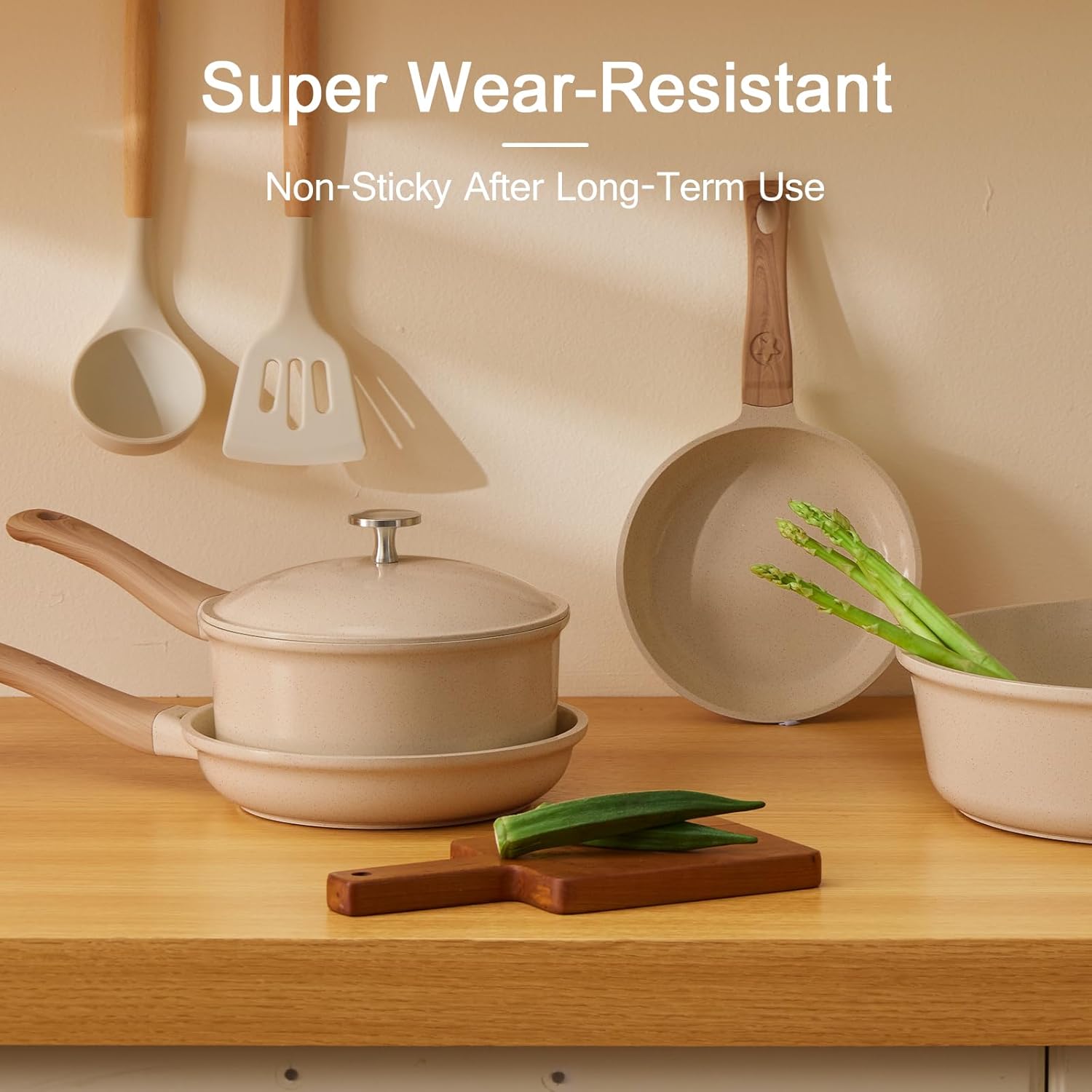 - 【Ti-Ceramic Coating Ultra Non-Stick & Non-Toxic】Engineered with a next-generation ceramic coating enhanced by titanium powder, this non toxic cookware set offers long-lasting nonstick performance and superior scratch resistance. 100% free from PFAS and other harmful chemicals—cook healthy with confidence.