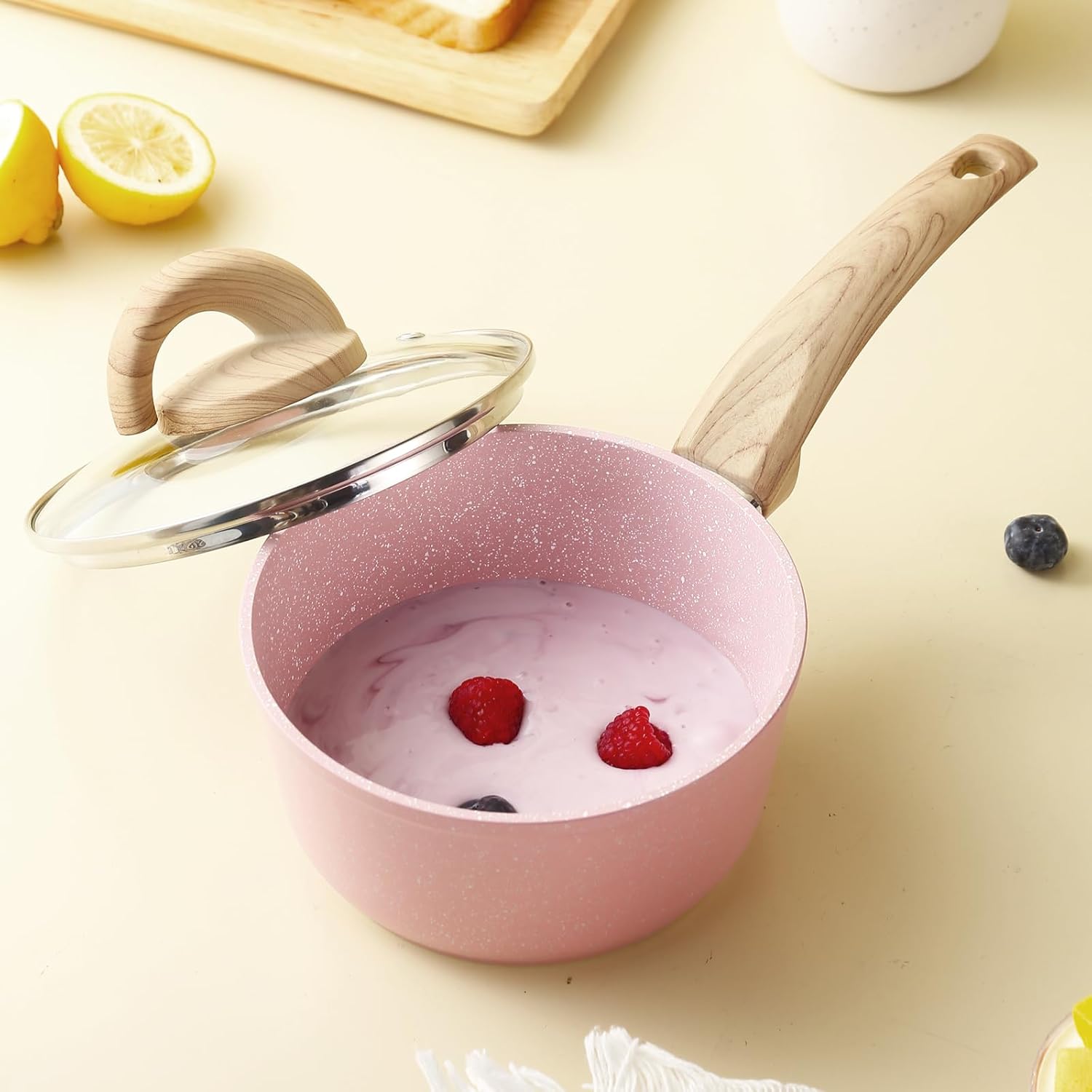 - Enjoy a tasty and safe cooking experience with the Vkoocy Series Set! This 6-piece cookware set includes a 9.5" frying pan, 11" frying pan, 1.5-quart sauce pan with Lid, 5-quart stockpot with Lid. Made with non-toxic ceramic and free of harmful chemicals, this set contains all the tools you need to fry, sear, roast, and simmer your favorite dishes without worry. Plus, It's also specially decorated with patterns to make your kitchen blend with nature;