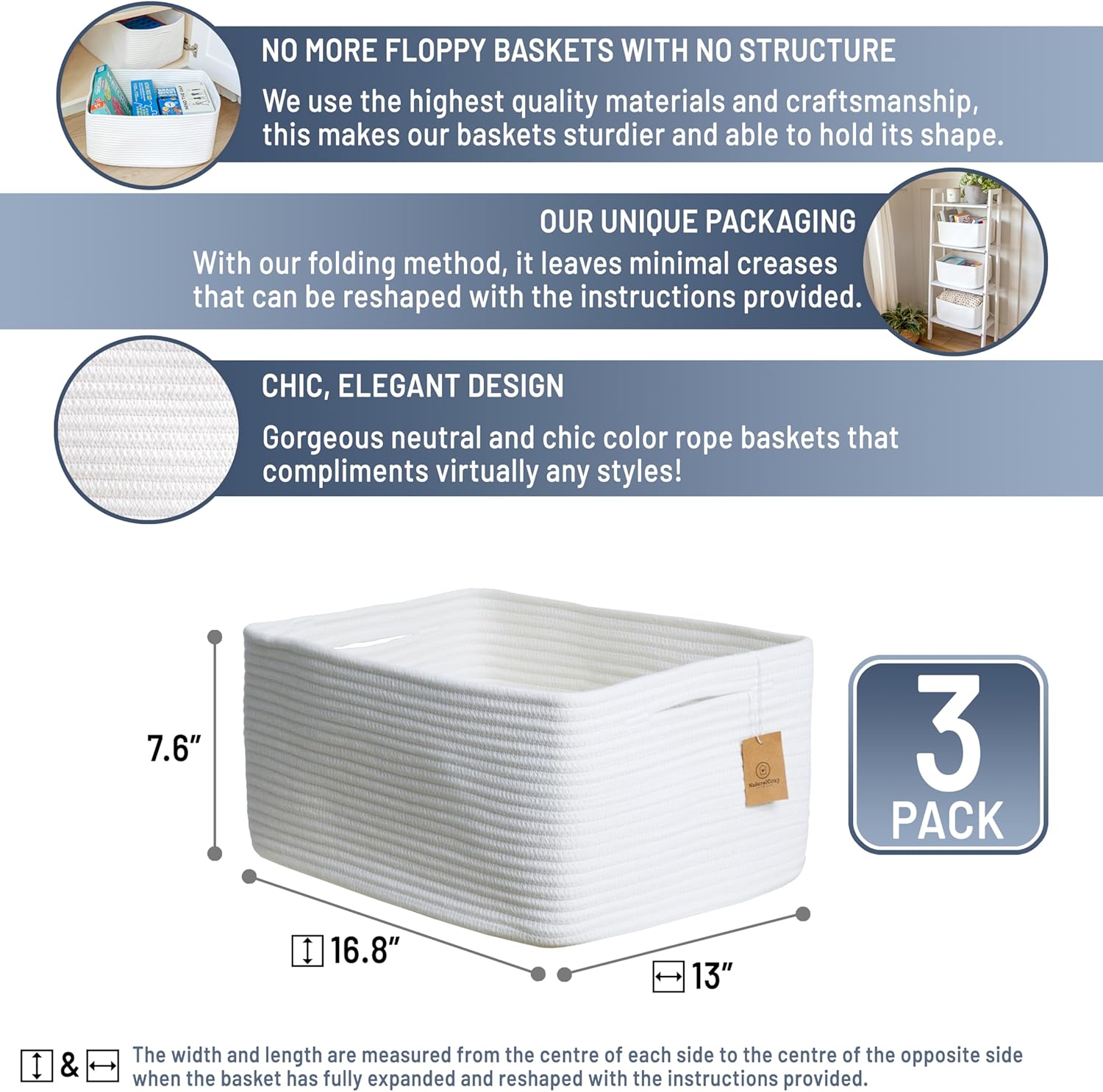NaturalCozy Storage Baskets 16.8”x13”x7.6” Cotton Rope Woven Baskets for Organizing 3-Pack | Toy Storage Bins | Basket for Shelves, Laundry, Blanket, Clothes, Closet, Kitchen, Bathroom, Gifts