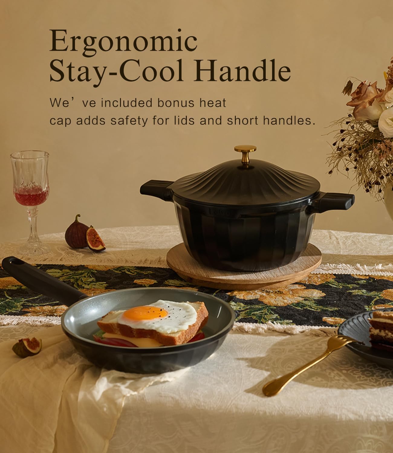 - Thoughtful Design for Everyday Ease: From streamlined ridges that lock in flavor to a raised notch that keeps the lid steady while boiling—every design choice serves a purpose. Dual-sided spouts make pouring easy from either side, and the stay-cool handle with heat cap adds comfort and safety.
