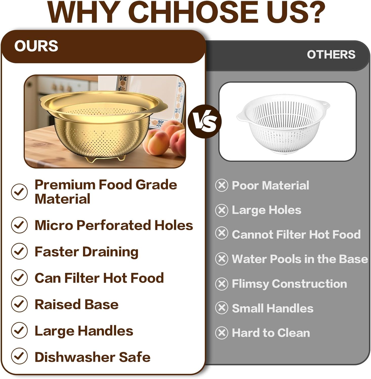 - [Quick-Drain & Dishwasher Safe] Our colander for kitchen has hundreds of precision holes that drain water in seconds - no shaking or waiting! The food-grade stainless steel resists stains, odors, and high temps (suitable for hot foods). Plus, it’s dishwasher-safe. Great for busy families or meal-prep enthusiasts who value speed and hygiene.