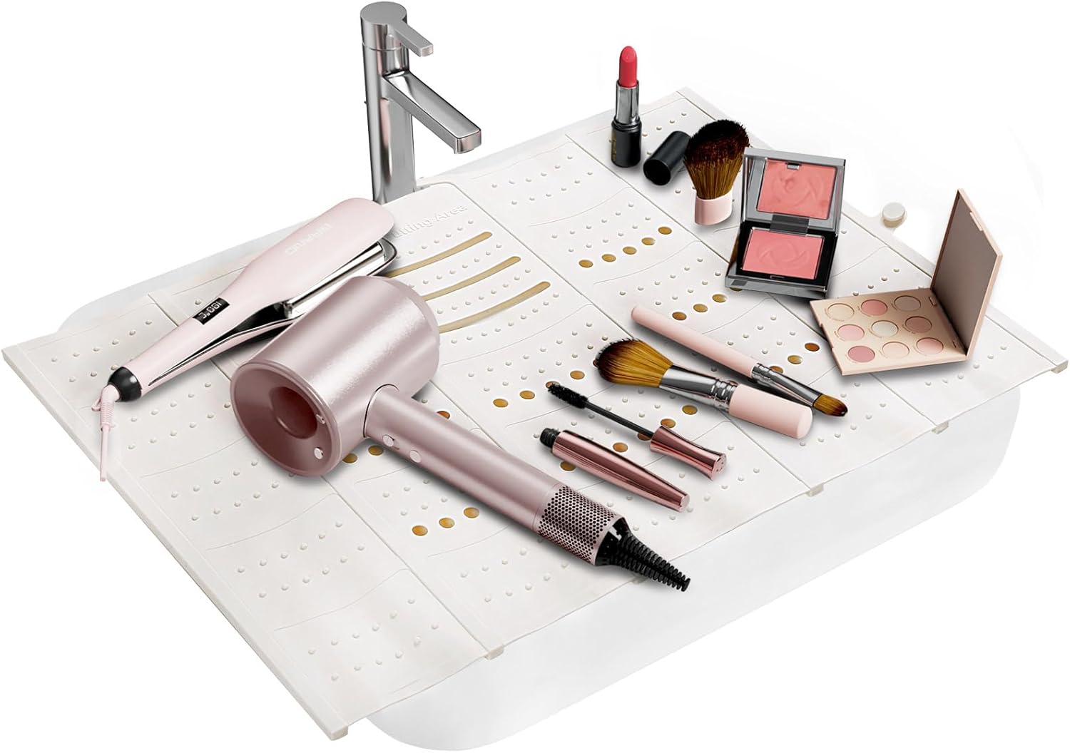 - High Quality: Crafted from high-quality silicone, this sink cover heat resistant up to 450 degrees Fahrenheit, safely place hot styling tools such as curling irons, hairdryers, or straighteners on its surface. And it with raised particle on the surface, convenient for you to clean your makeup brush.