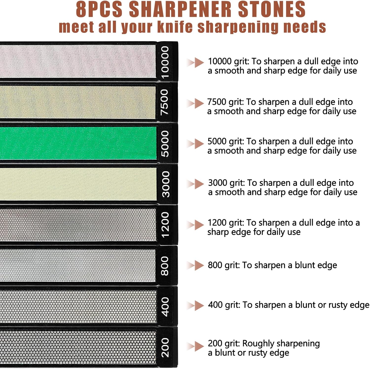 - 【Diamond Sharpening Stone Set】This versatile set includes 8 diamond sharpening stones with different grits: #200, #400, #800, #1200, #3000, #5000, #7500, and #10000. You can select the appropriate stone based on the grit and smoothness required for your blades. The set also comes with a convenient spray bottle to ensure proper lubrication during the sharpening process, requiring only a small anount of water spray.