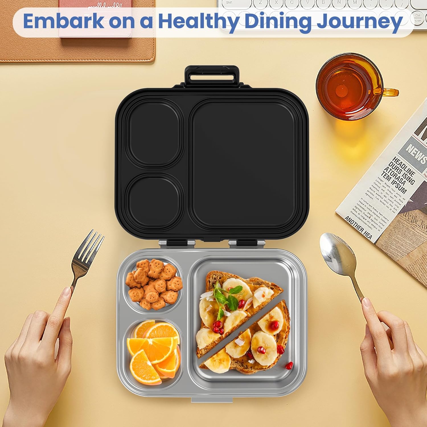 Stainless Steel Bento Lunch Box for Kids | 3-Compartment Lunch Box Container Kids | 100% Leakproof, Dishwasher-Safe, Eco-Friendly, Perfect Portion Control for Kids&Adult Healthy Meals (Black)