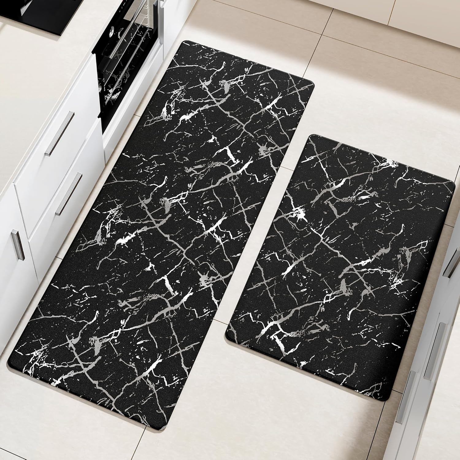 Silver Foil Stamped Marble Kitchen Mats for Floor 2PCS Cushioned Anti Fatigue Non Slip Waterproof Comfort Leather Kitchen Rugs 2/5 Inch PVC Kitchen Mats for Sink, Laundry, 17.3"x28"+17.3"x47", Black
