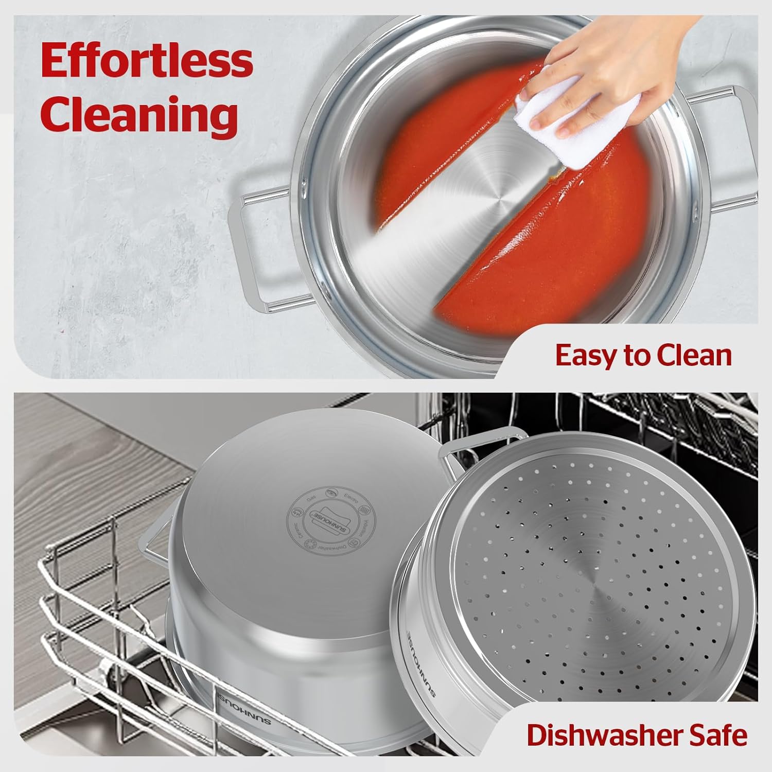 [New Version] Sunhouse 2-Tier Stainless Steel Steamer Pot with Lid - Larger 5.5 QT Steamer & 3.8 QT Stockpot Base - Induction Ready, Compatible with All Cooktops