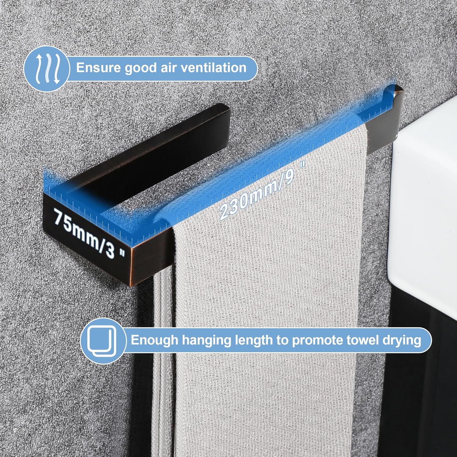 - 10 INCH TOWEL BAR - The overall length of the oil rubbed bronze towel holder for bathroom wall is 9.45". The length of hanging space is 8.6" and the maximum load is 17.6 lbs. 2.18 inches apart from the wall for quick and thorough air drying.