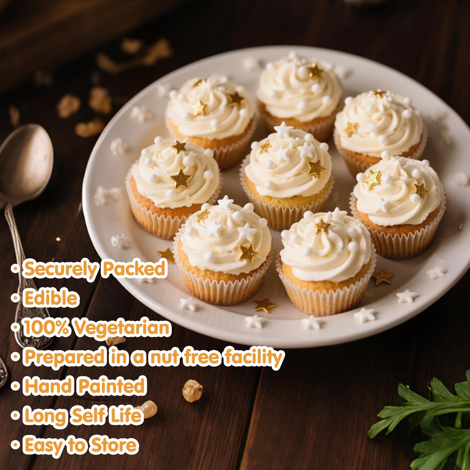 - Versatile Dessert Decoration:Our sprinkles includes 2 different sizes of Gold and White stars,perfect for meeting all your baking decoration needs.The sugar decorations are edibled candies.It is normal for large candies to have a hard texture and can be eaten with confidence.After baking,decorate the cookies or cake with star sugar to avoid melting