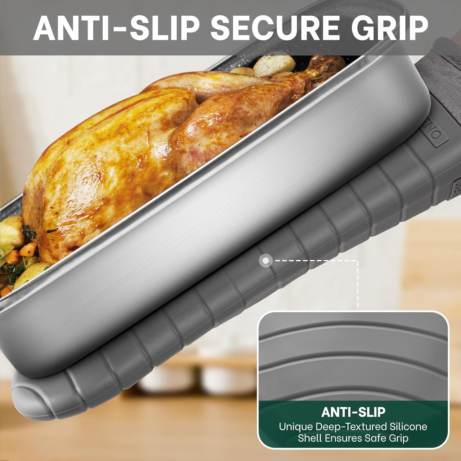 - Non-Slip Flexible Grip: These silicone oven mitts features a deep-textured slip-resistant stripe pattern with a unique ergonomic arc-shaped texture design on the fingers and thumbs, allowing the mitts moves with your hands better, delivering a slip-proof grip and safe control to grab, lift, and maneuver hot oil cooking pans and heavy oven racks