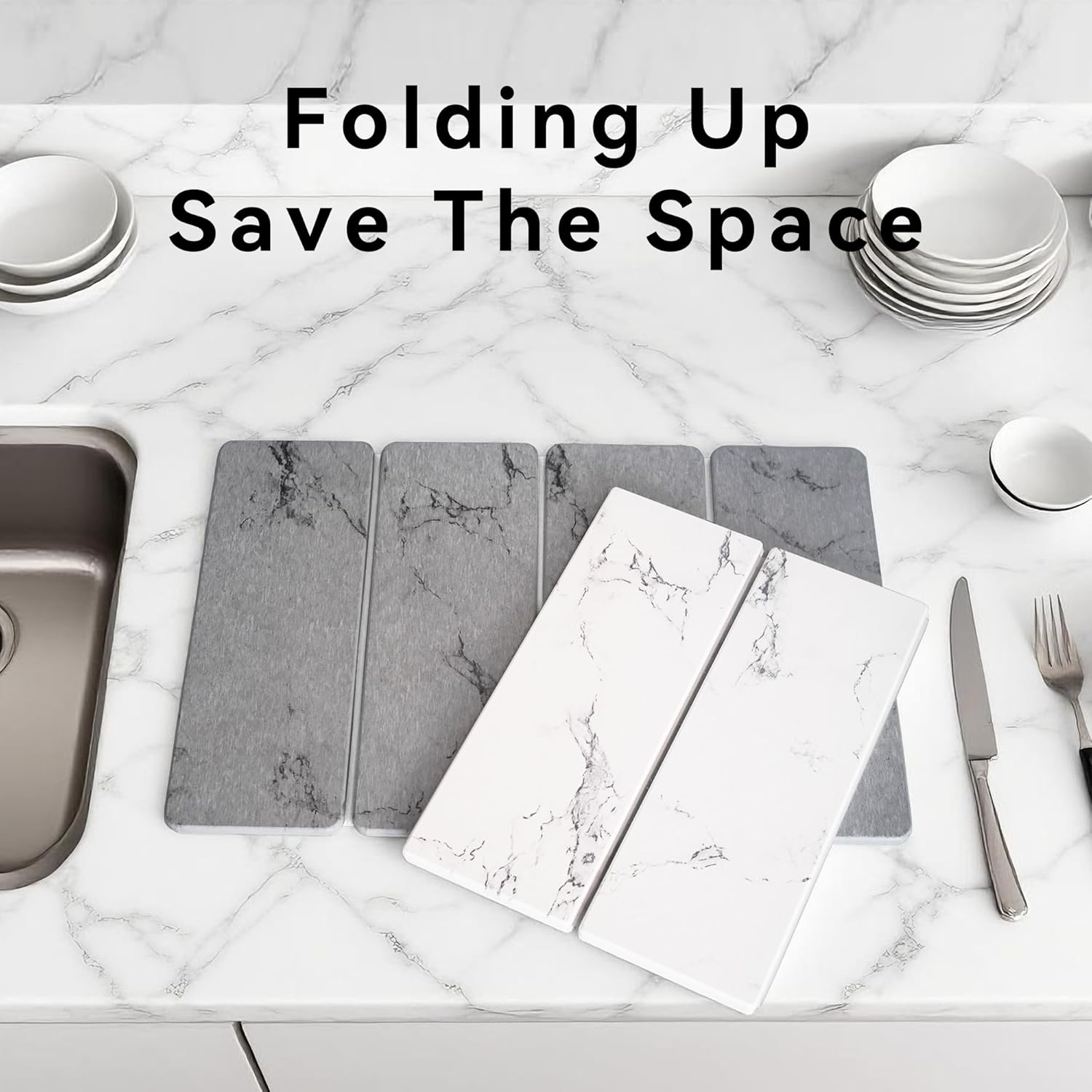 Large Stone Dish Drying Mat, Foldable Stone Drying Mat, 24" x 16" Diatomaceous Earth Drying Mat for Kitchen Counter, Super Absorbent Fast Dry Mat, Drying Board Diatomaceous for Kitchen, Marble Gray