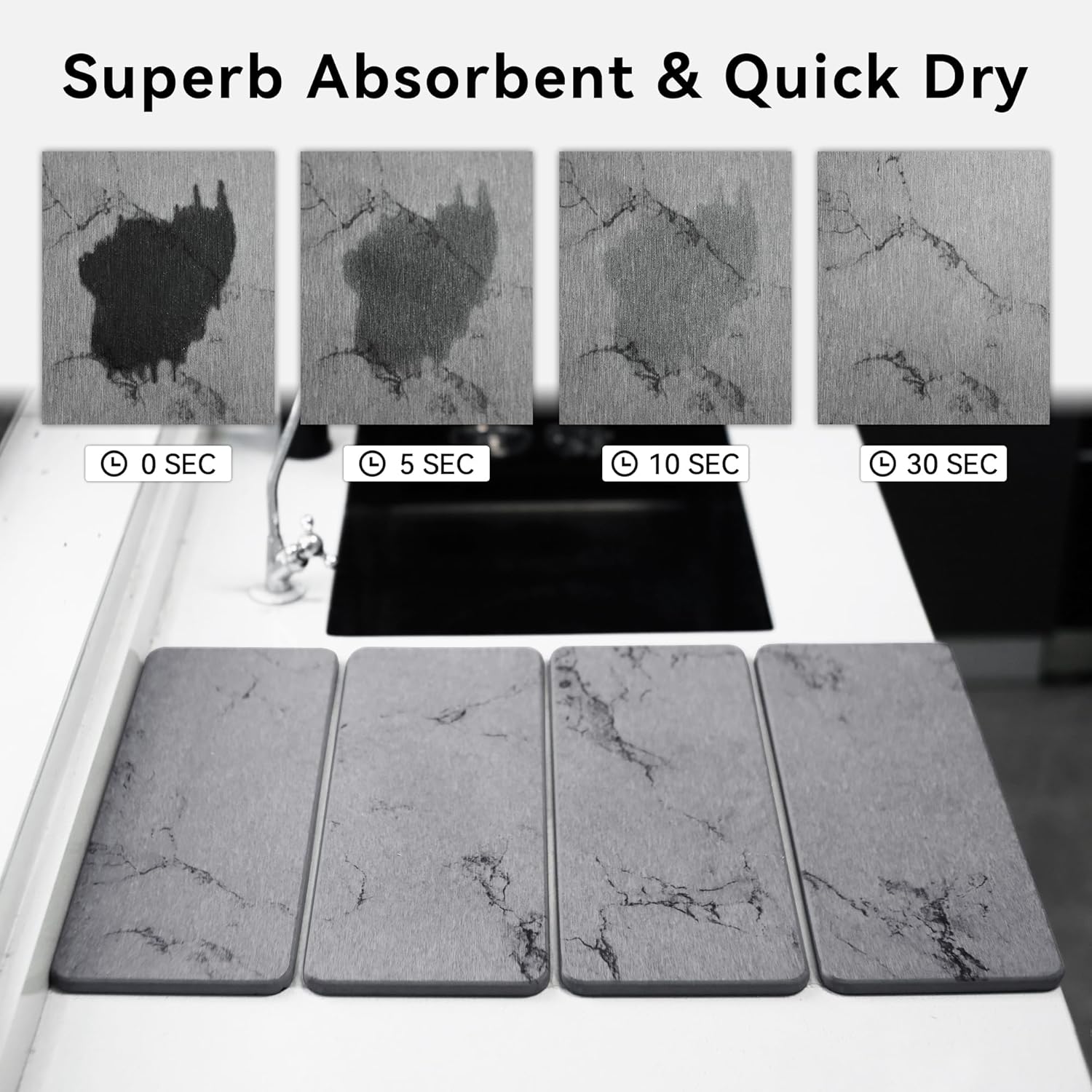 - Super Absorbent Stone Dish Drying Mat: Made of 100% natural diatomaceous earth, this diatomaceous earth drying mat has super absorbent properties and can absorb moisture in seconds, quickly drying and keeping the tabletop dry. Paired with marble texture, it is a sustainable and safe choice for your kitchen, balancing environmental protection with fashion.