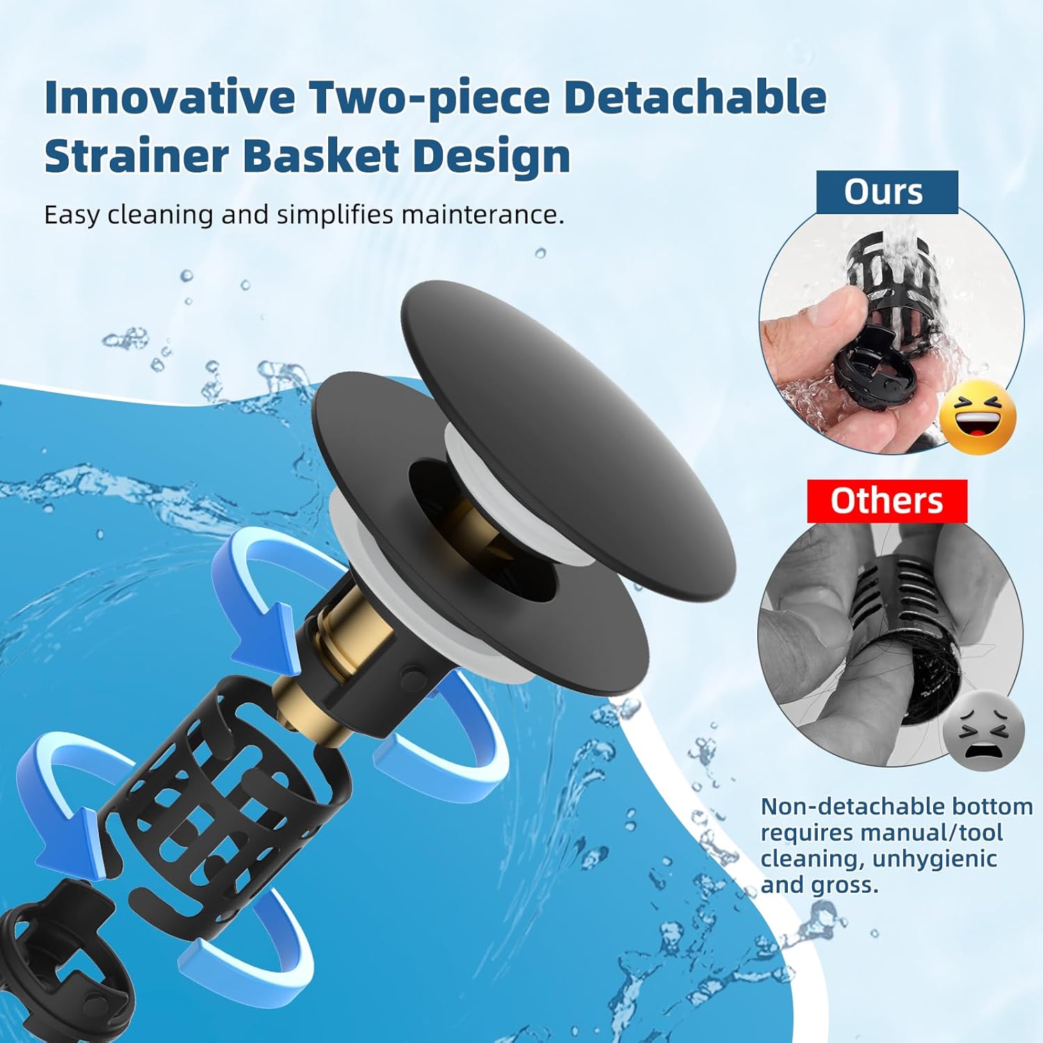 - [Easy Installation and Maintenance] The installation is quick and hassle-free, simply remove your old stopper and insert the new one into the drain hole, installation only takes a few seconds. Cleaning is just as easy. The dual-layer removable basket can be easily removed by simply twisting, allowing you to thoroughly clean all components of the drain stopper. The basket's detachable bottom design prevents the awkwardness and inconvenience of digging out items by hand