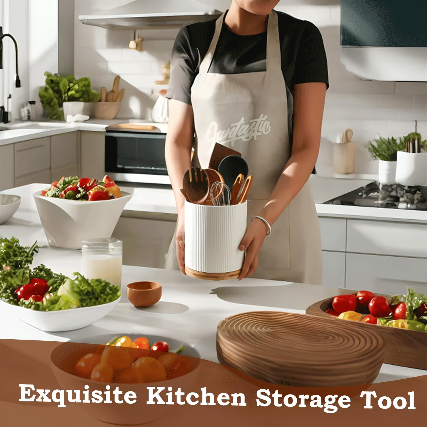 Utensils Holder 360ยฐ Rotating Ceramic Kitchen Utensils Holder for Countertop, Utensil Crock for Farmhouse Kitchen Dรฉcor, Rotatable & Detachable Wooden Base [White]