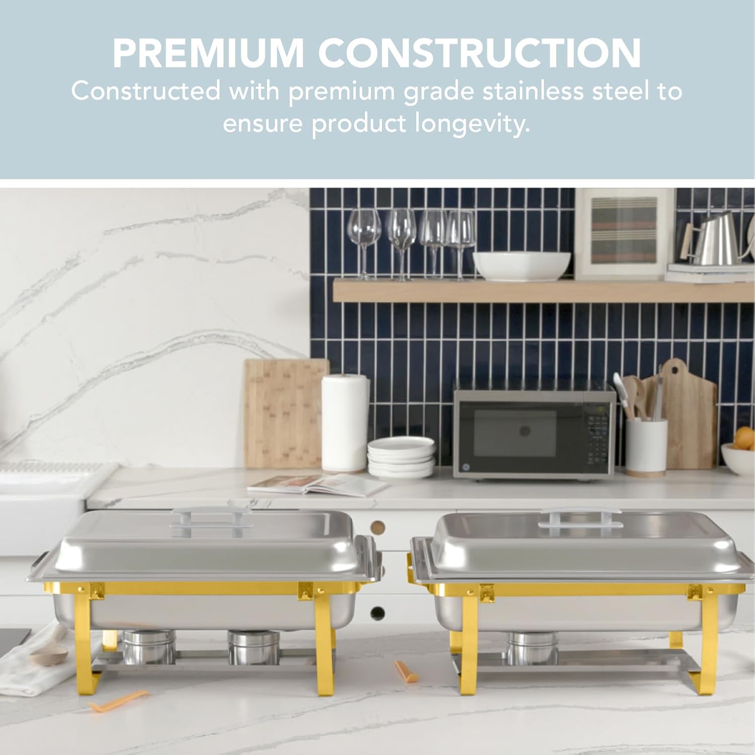 4 Pack 8QT Chafing Dish Full Set – Stainless Steel Catering Chafer with Lids, Pans & Fuel Holders – Buffet Food Warmers for Parties, Events & Weddings – Gold Frame
