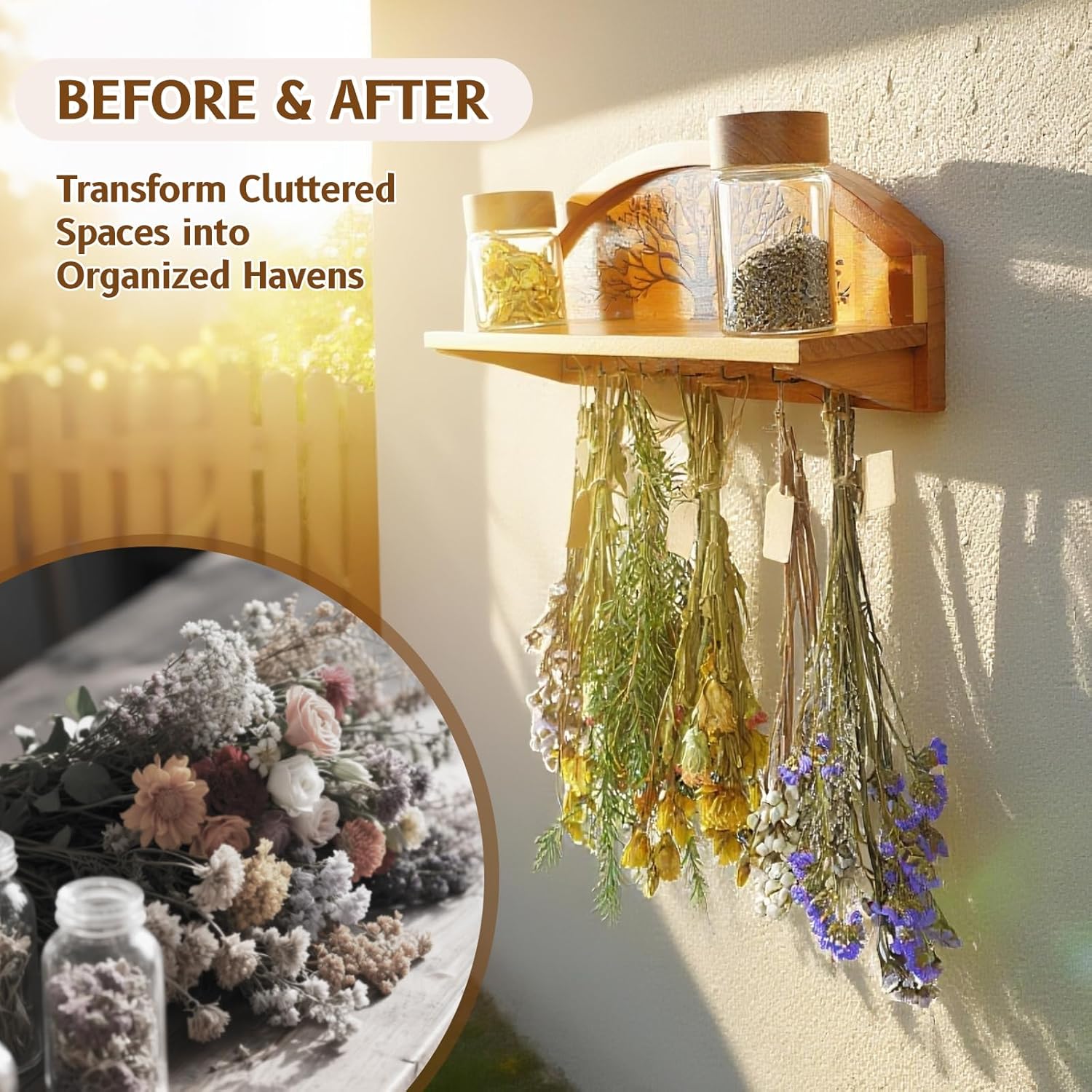 - Wall-Mounted Design, Double-Tier Convenience: This robust wall-mounted shelf is engineered to securely hold an array of items while ensuring safety in your home. Measuring 14.96 inches (L) x 5.2 inches (W) x 6.38 inches (H), its elegant design seamlessly complements decor such as tree of life wall art. The top shelf is ideal for displaying plants, allowing easy access to jars and treasures, while 7 sturdy hooks serve as perfect plant hangers for drying herbs and flowers.