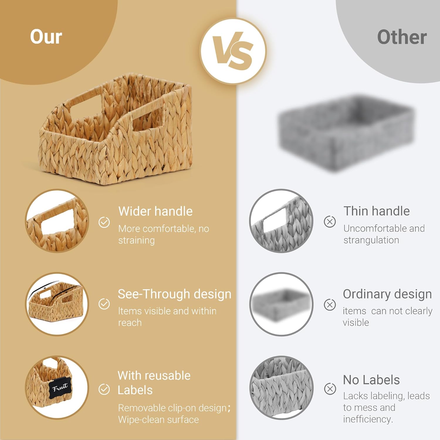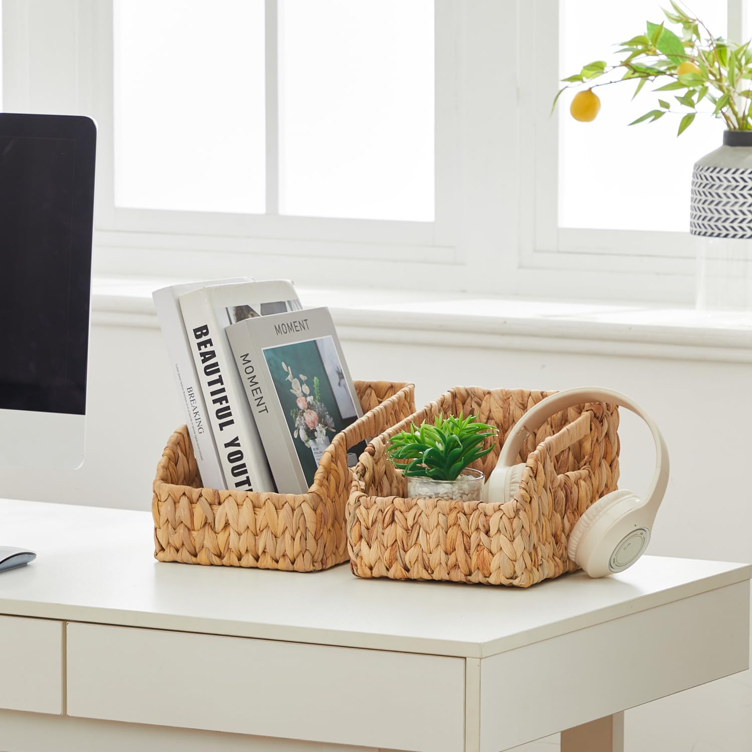 Wicker Baskets for Organizing,Pantry Baskets with Built-in Handles, Handwoven Wicker Storage Basket, Water Hyacinth Storage Bins for Shelves, 3 Pack, Natural 2 Set