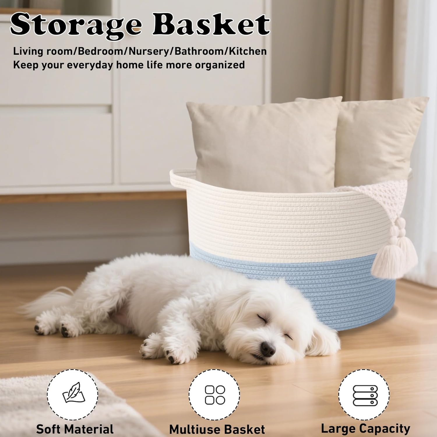 Large Blanket Basket for Organizing,65L Closet Organizers and Storage Bins Box for Shelves Woven Rope Storage Baskets,Living Room,Bedroom,Dorm,Laundry room (White&Blue)