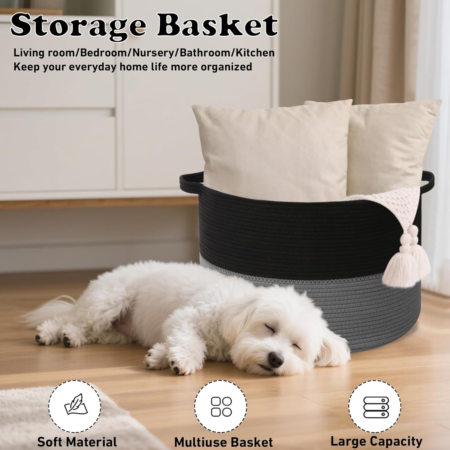 Large Blanket Basket for Organizing,65L Closet Organizers and Storage Bins Box for Shelves Woven Rope Storage Baskets,Living Room,Bedroom,Dorm,Laundry room (Black&Dark Grey)