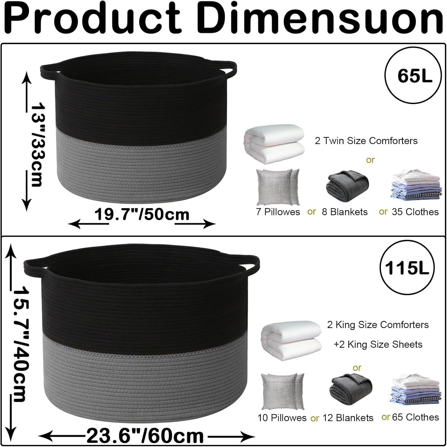 Large Blanket Basket for Organizing,115L Closet Organizers and Storage Bins Box for Shelves Woven Rope Storage Baskets,Living Room,Bedroom,Dorm,Laundry room (Black&Dark Grey)