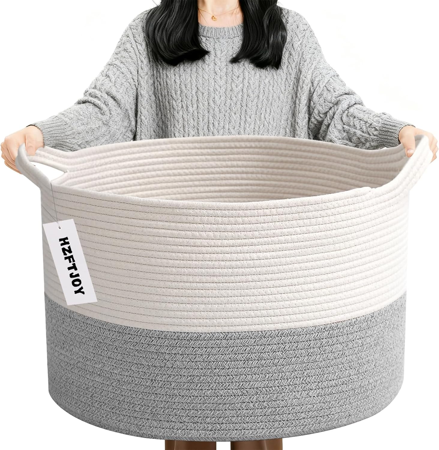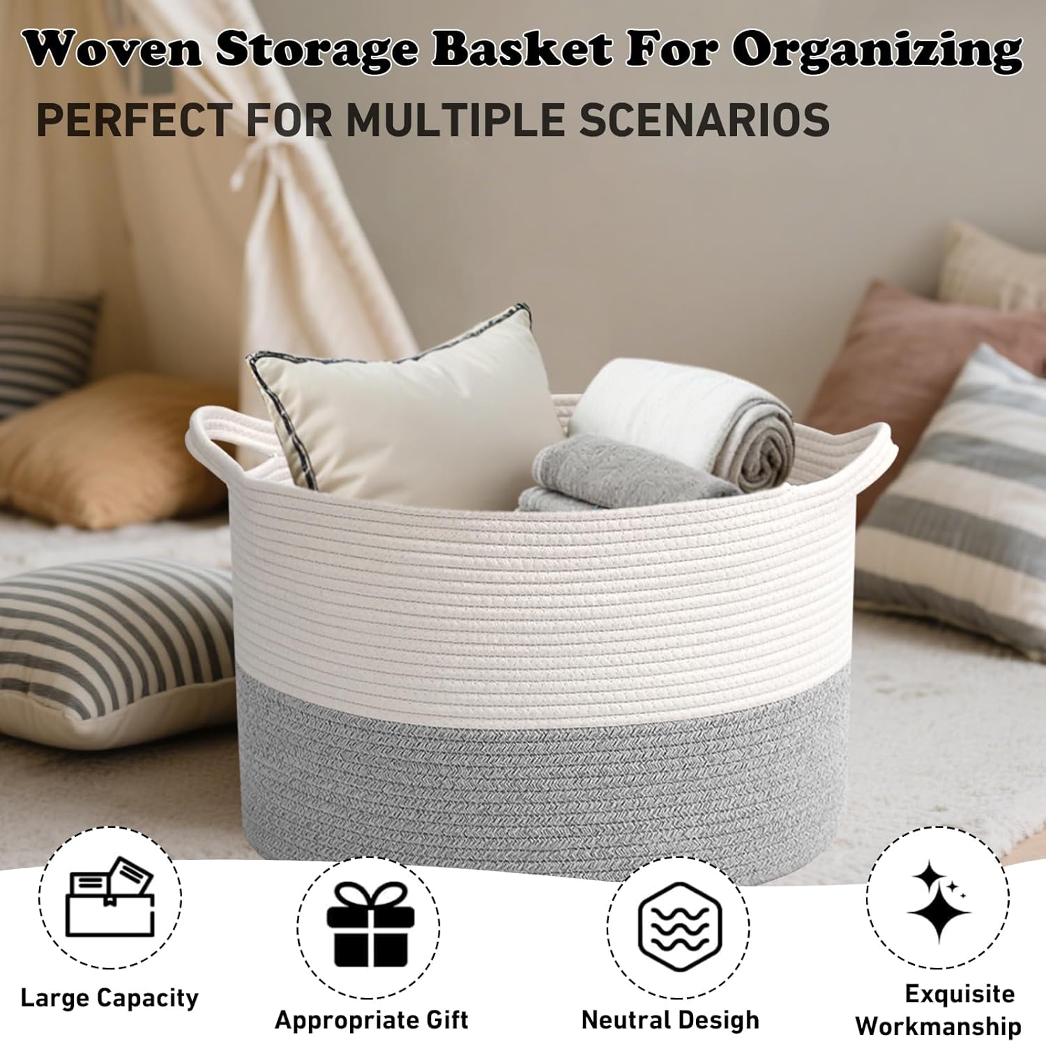Large Blanket Basket for Organizing,65L Closet Organizers and Storage Bins Box for Shelves Woven Rope Storage Baskets,Living Room,Bedroom,Dorm,Laundry room (White&Grey)